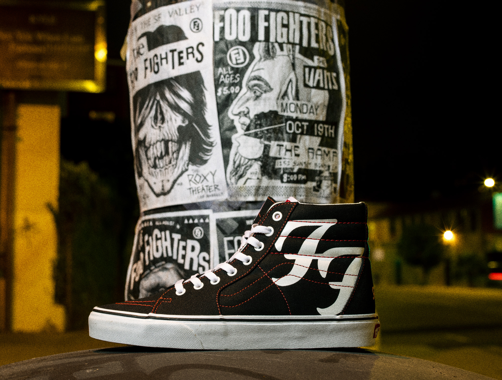 O Sk8-Hi apresenta a parte superior preta com costura em contraste vermelho, o logotipo duplo F do Foo Fighters em branco nas laterais, e “Foo” e “Fighters” em vermelho em cada calcanhar. Uma etiqueta bordada da edição especial do 25º aniversário é encontrada na língua e a tradicional Sidestripe do Sk8-Hi é apenas sugerida, com sua forma delineada em costura de contraste – uma homenagem ao estilo musical despojado do Foo Fighters.