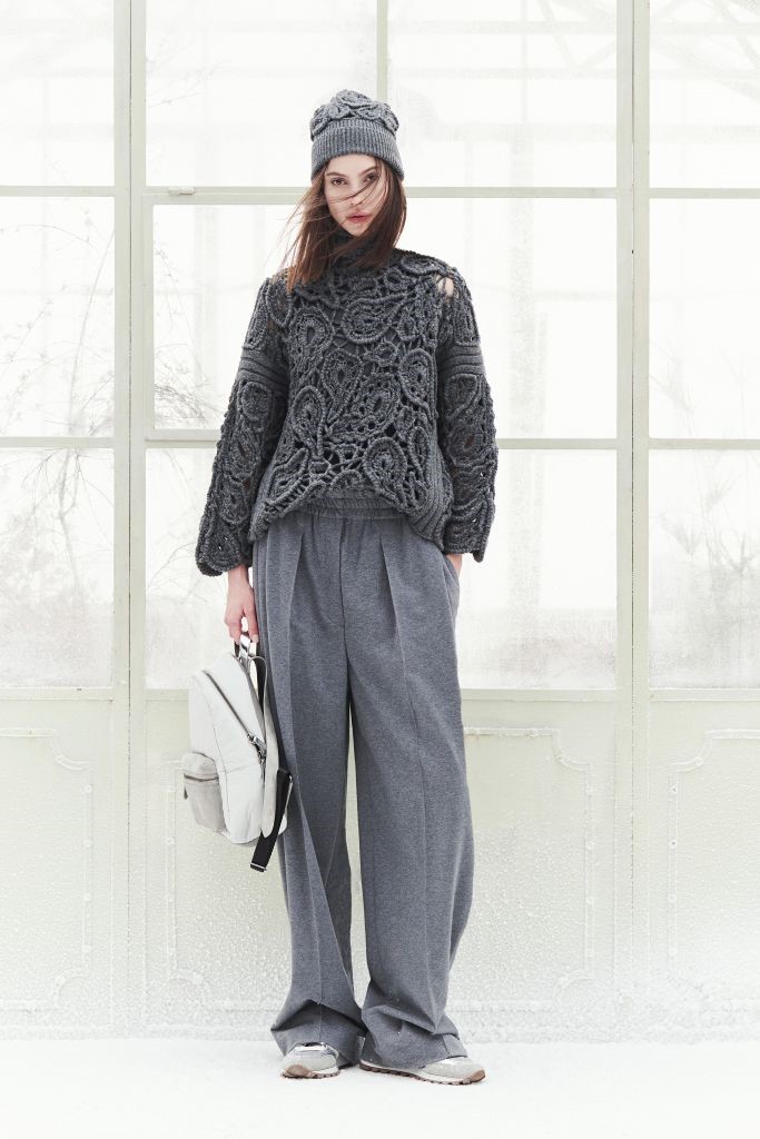 As malhas influenciam deliciosamente todas as categorias da coleção, surgindo em casacos fluidos e leves, nos blazers, nas jaquetas e em conjuntos diversos, bem como em bolsas e calçados, evocando conforto e aconchego.