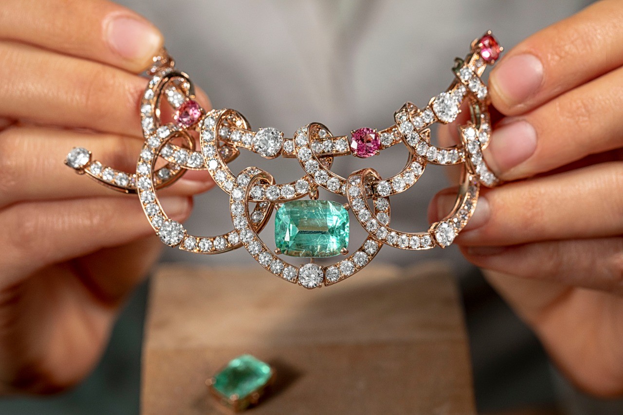 Com sua cor verde-mar, que não se assemelha a nenhuma outra, esta pedra possui uma tonalidade mágica intensa e resplandecente conjurando um Éden mediterrâneo de exuberante volúpia e ecletismo: de fato, a gema deve sua cor verde-água única à presença de cobre e manganês, que emitem reflexos deslumbrantes mesmo quando há uma luz fraca.