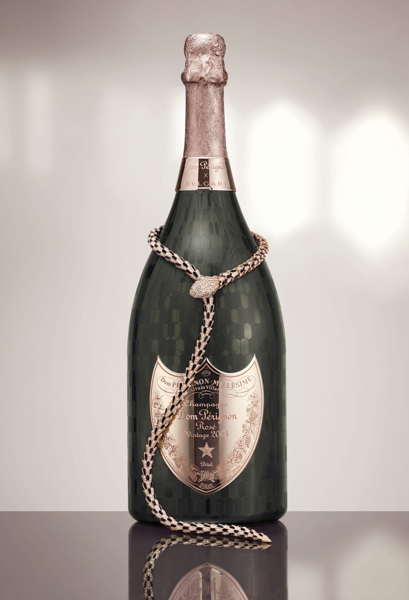 O colar Serpenti é acompanhado por uma caixa de três garrafas magnum de Dom Pérignon x Bvlgari Limited Edition Vintage Rosé 2004. Cada uma delas está gravada com o padrão Bvlgari Serpenti, exaltando a emoção inigualável de experimentar o vinho.