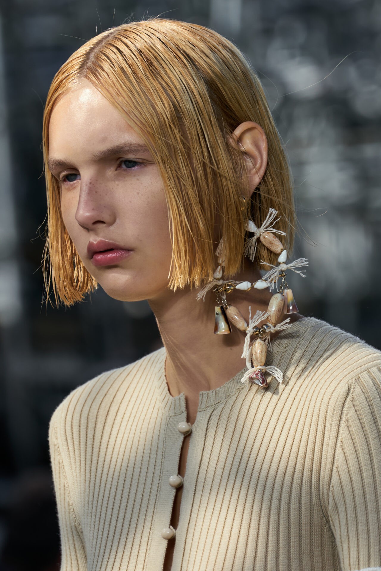 Os acessórios foram um dos grandes destaques. Conchas são tecidas à mão em colares feitos com tecidos de sobras de estoque e intercaladas com pedras preciosas. As gemas encontradas em todo a coleção são todas de origem natural.