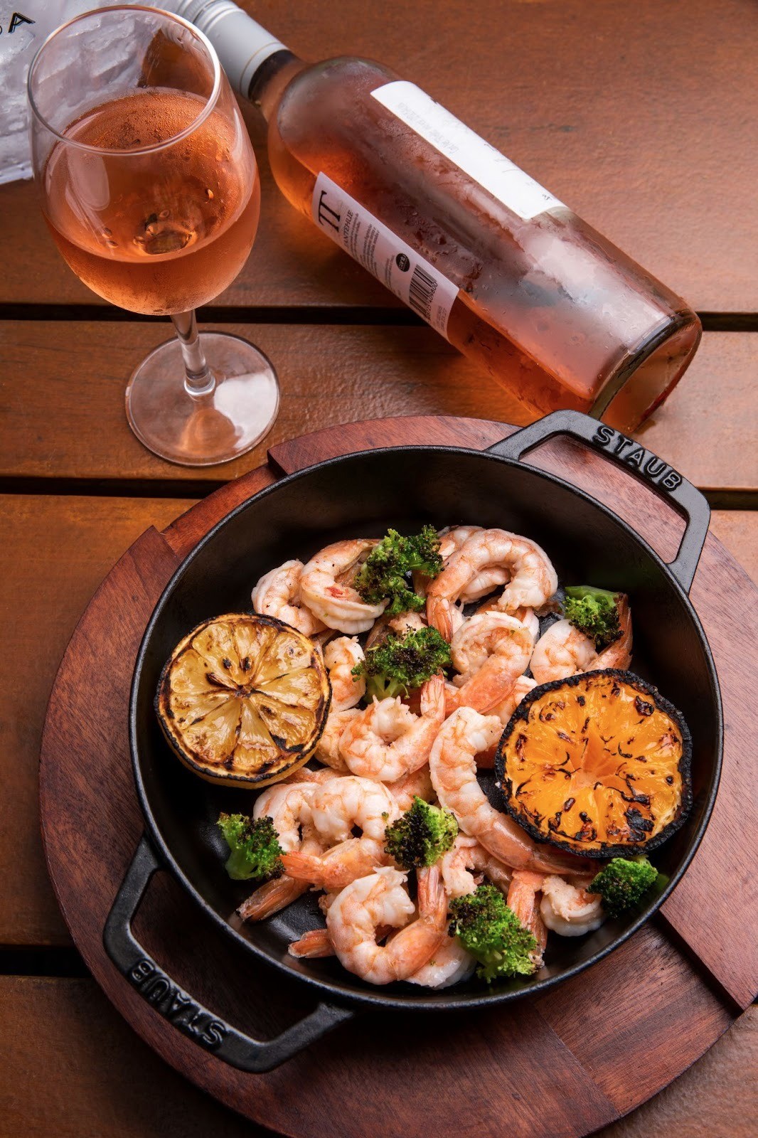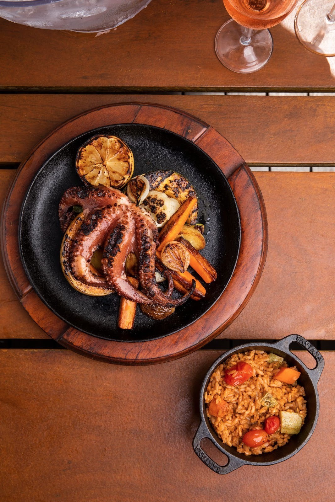 SABORES DO FOGO — No cardápio, opções de pratos como a “Picanha do sol no melhor da brasa”, “Ribeye steak” (à base de porco), “Tambouille de peixe”, “Polvo no fogo da grelha”, “Cocotte de legumes defumados e grelhados com arroz braseiro”, o sanduíche “Hambúrguer de costela premium”, o petisco “Camarão mandarine” e o antipasto “Pão de Campanha”.