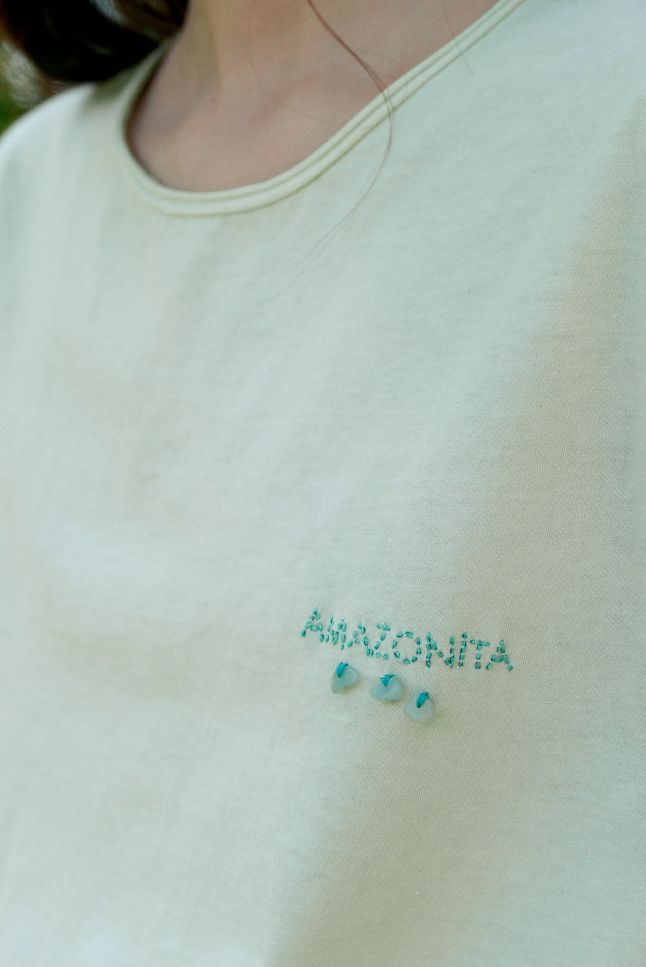 Uma das novidades que se inspiram da natureza são as t-shirts com tingimento natural e cristais bordados a mão que trazem um significado muito especial e tornam cada peça única. Na versão Quartzo Rosa, que potencializa a energia do amor, da felicidade e da saúde emocional, o top foi tingido por uma fervura de beterraba. Na versão Ametista, que potencializa a sabedoria, o equilíbrio, a proteção e a vitalidade, a t-shirt foi tingida em uma fervura de pitaya. Já na versão Amazonita que abre caminhos para a criatividade, traz sorte e boas energias, o tingimento foi obtido com uma fervura de hortelã e espinafre, valorizando a riqueza e saberes da natureza.