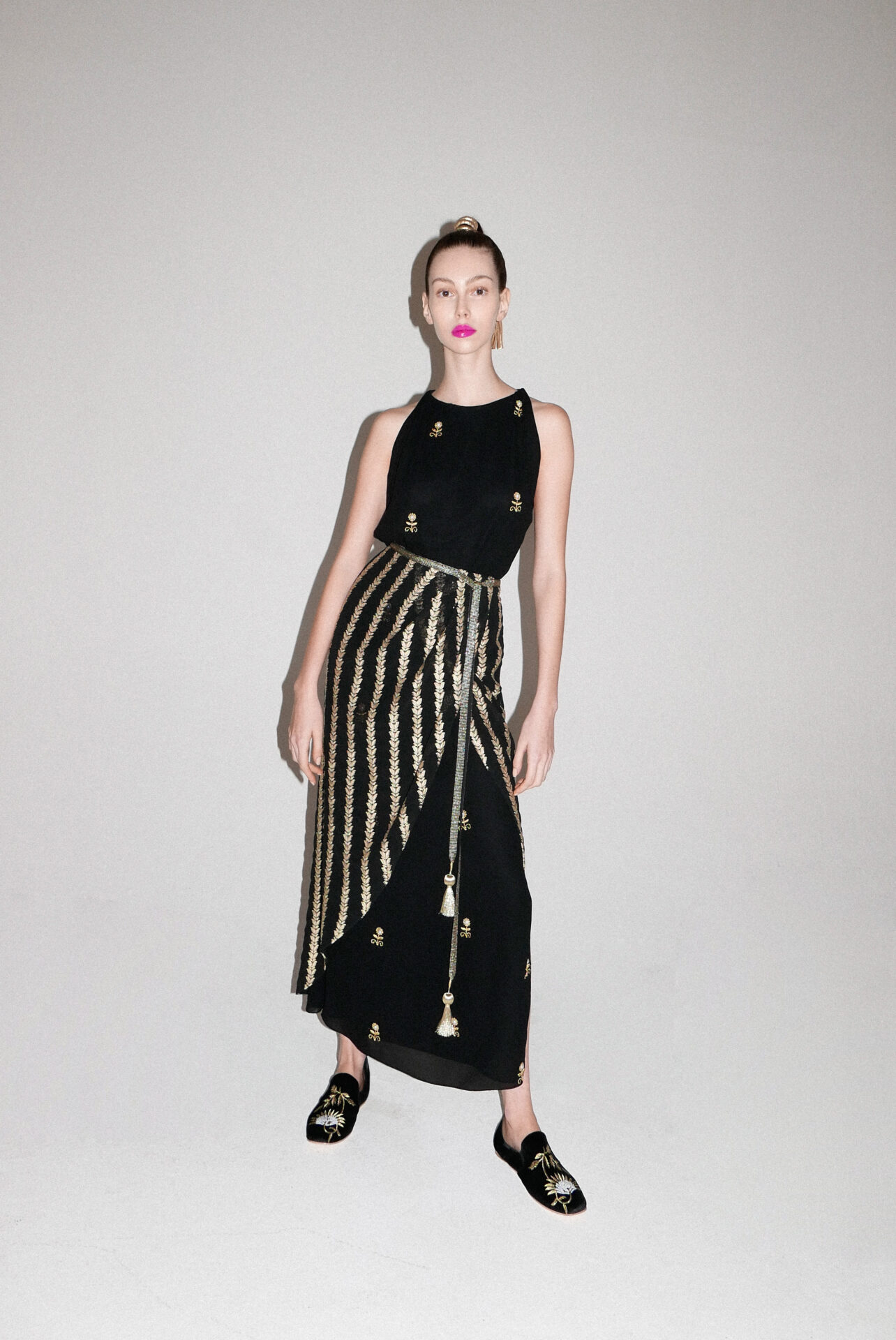 Para terminar os looks, cinturas marcadas por cintos de design único, maxi brincos de cristais e miçangas, finalizando com colar e pulseira em espiral dourado com detalhes pintados à mão.