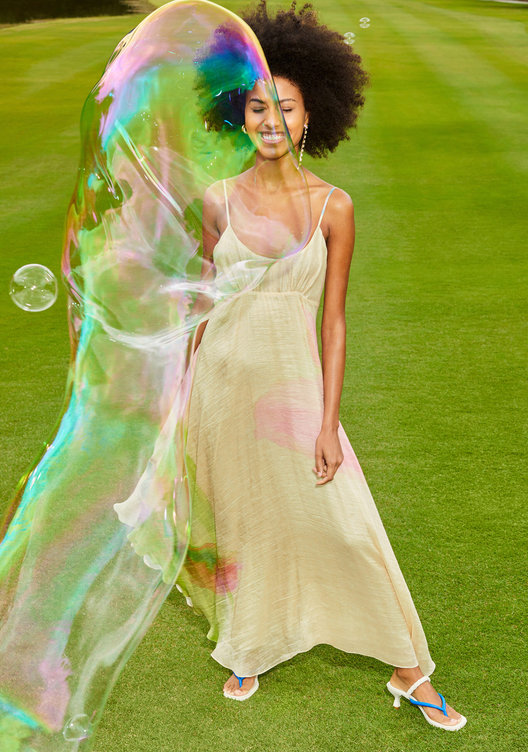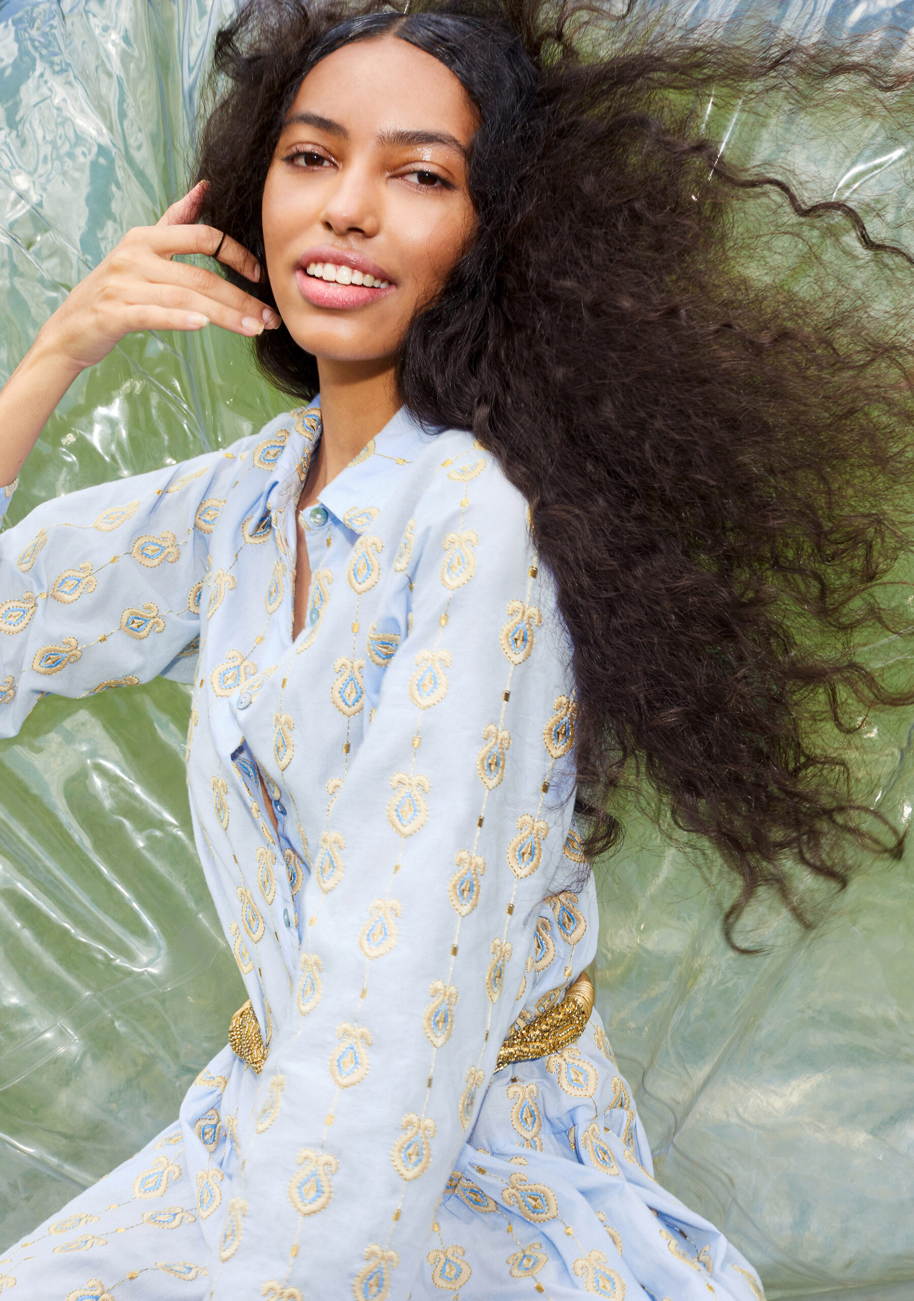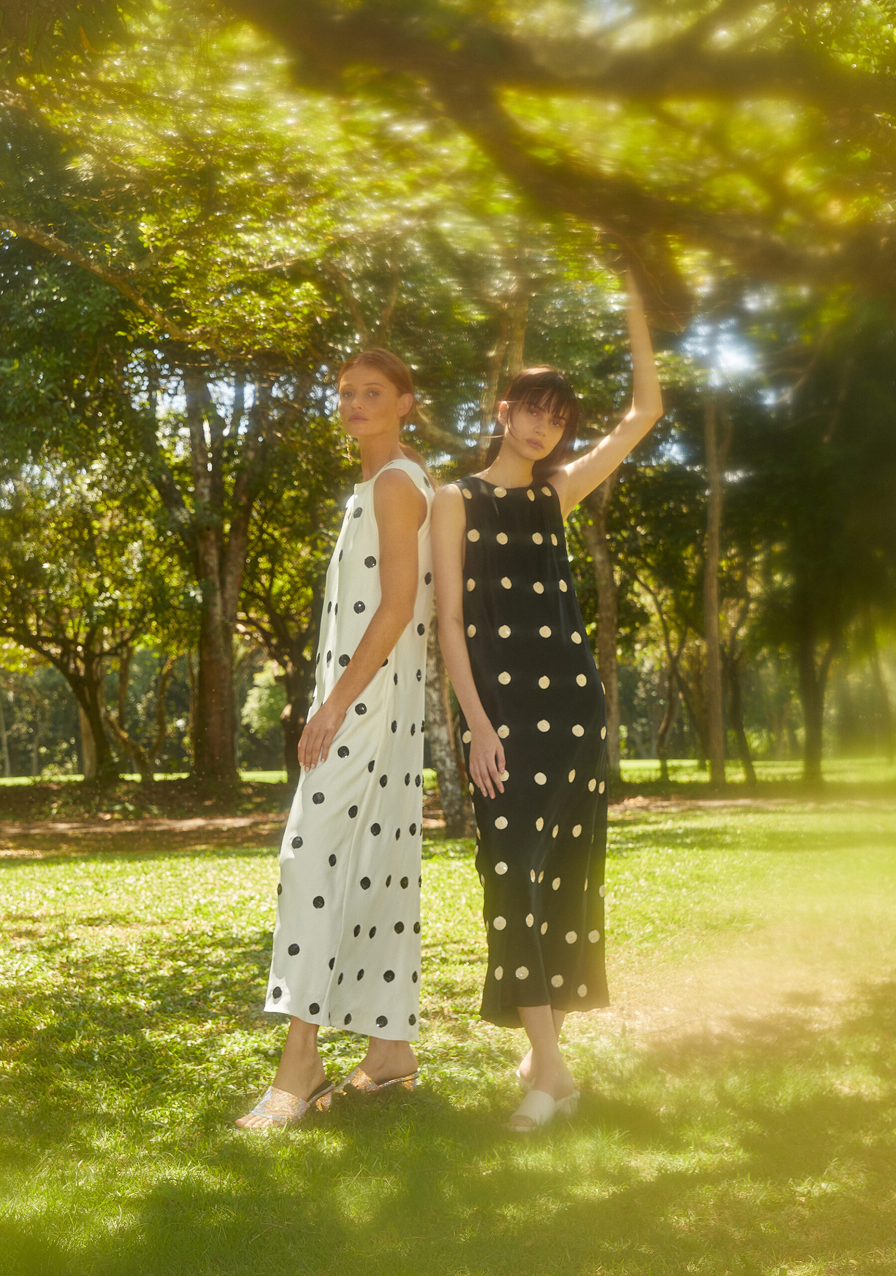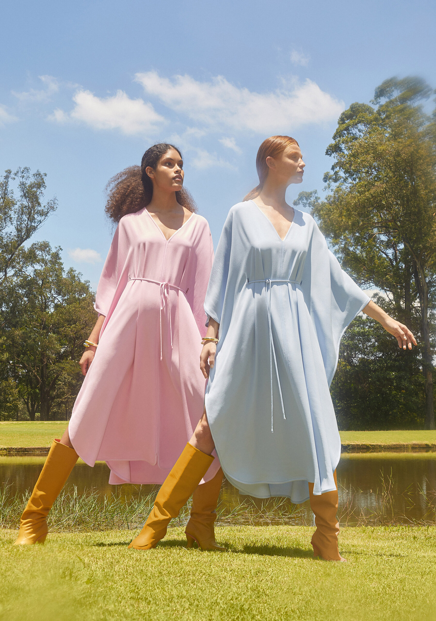 Modelagens fluidas nas cores azul celeste e off white com traços de crayon coloridos pintados à mão representam a liberdade de criação e dão vida a calças de cintura baixa e vestidos de corte reto. Outras composições como vestidos de seda com caimentos leves, cinturas marcadas e mangas esvoaçantes, conjunto de blazer com bermuda no azul pacífico complementam esta primeira edição com modernidade.
