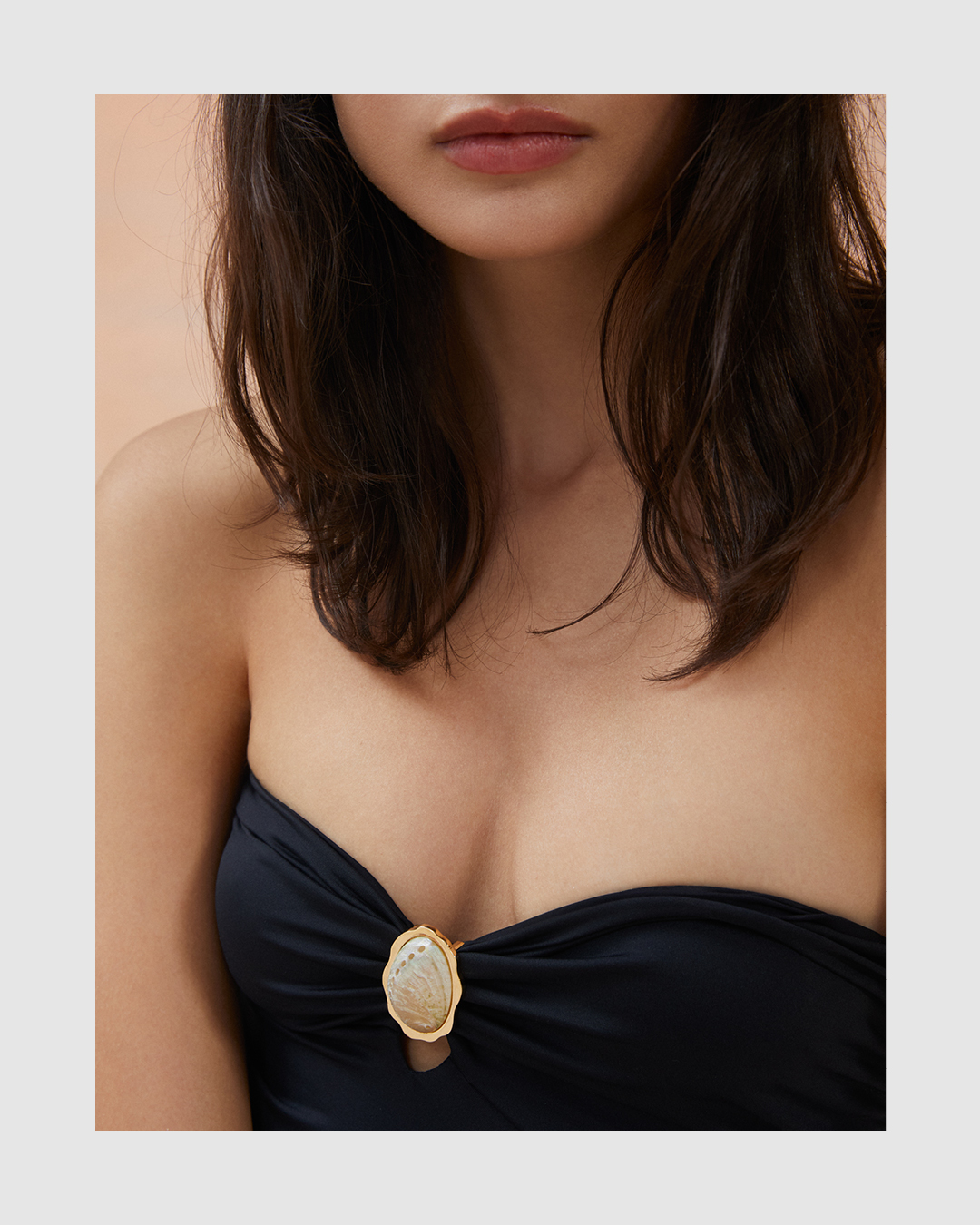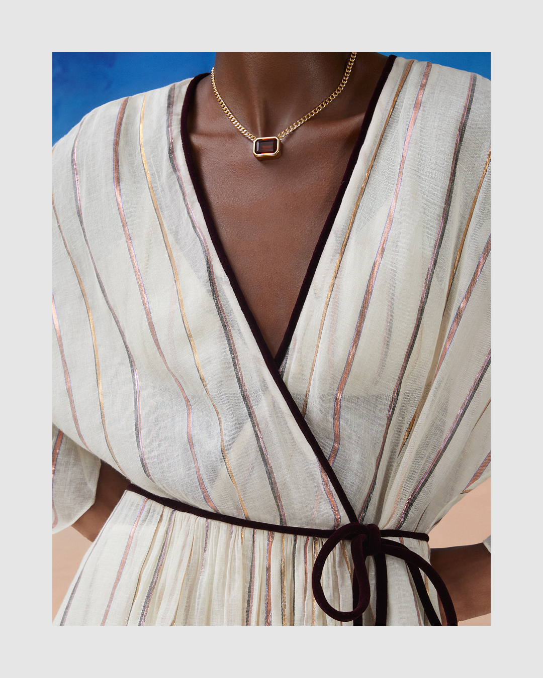 A Cápsula Mujer de Arena se destaca pelo tecido de algodão leve com fios de lurex na vertical dando um ar sofisticado e moderno para as peças. O vestido transpassado ganha detalhe de veludo no decote e na amarração, já a camisa com botões frontais é a escolha perfeita para usar junto com a saia de mesma estampa. Destaque para a sandália de glitter preta e a sua variante cor de rosa para transformar o look a noite.