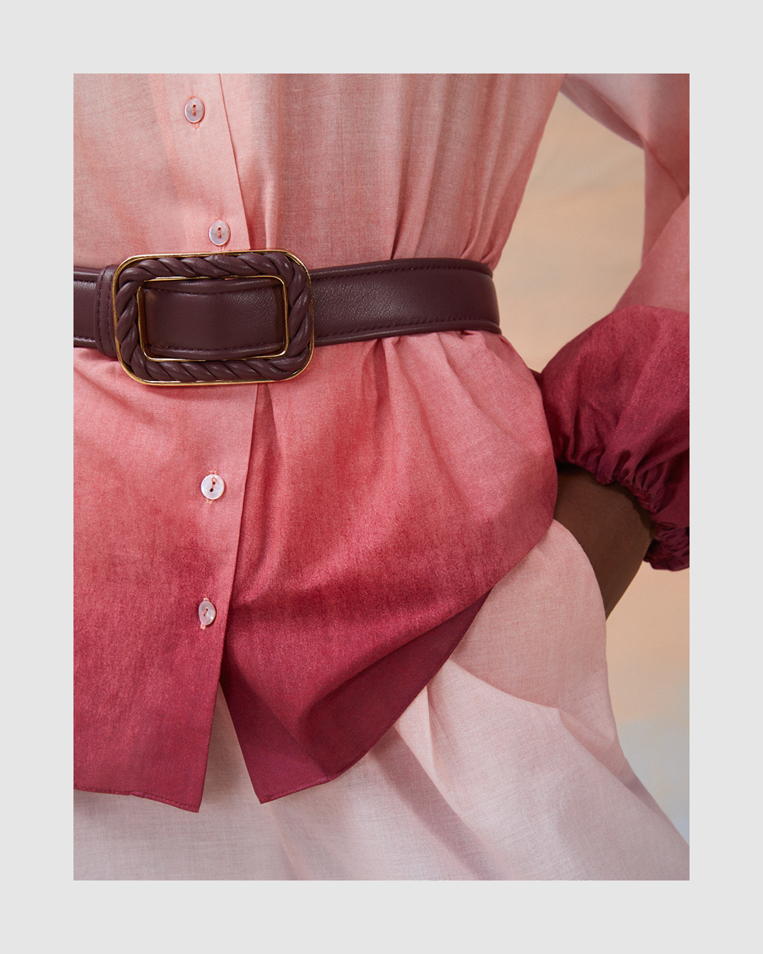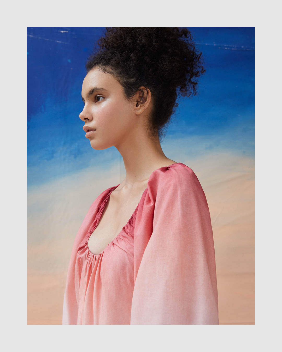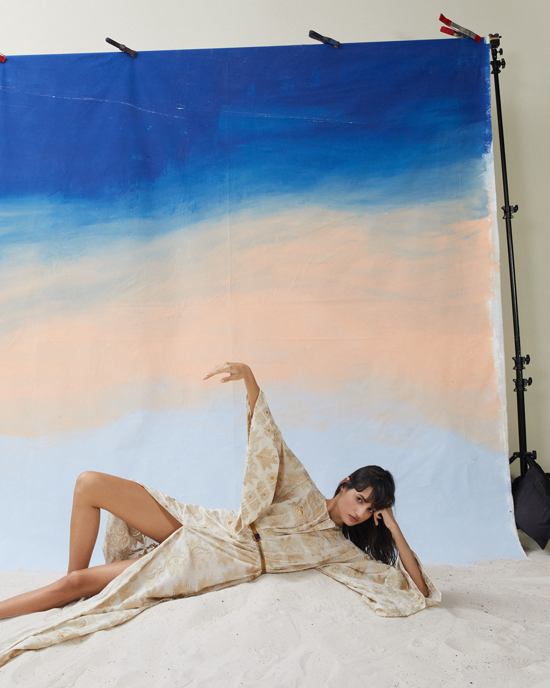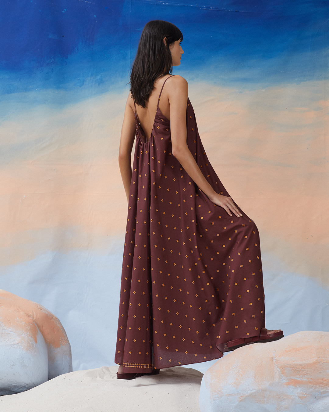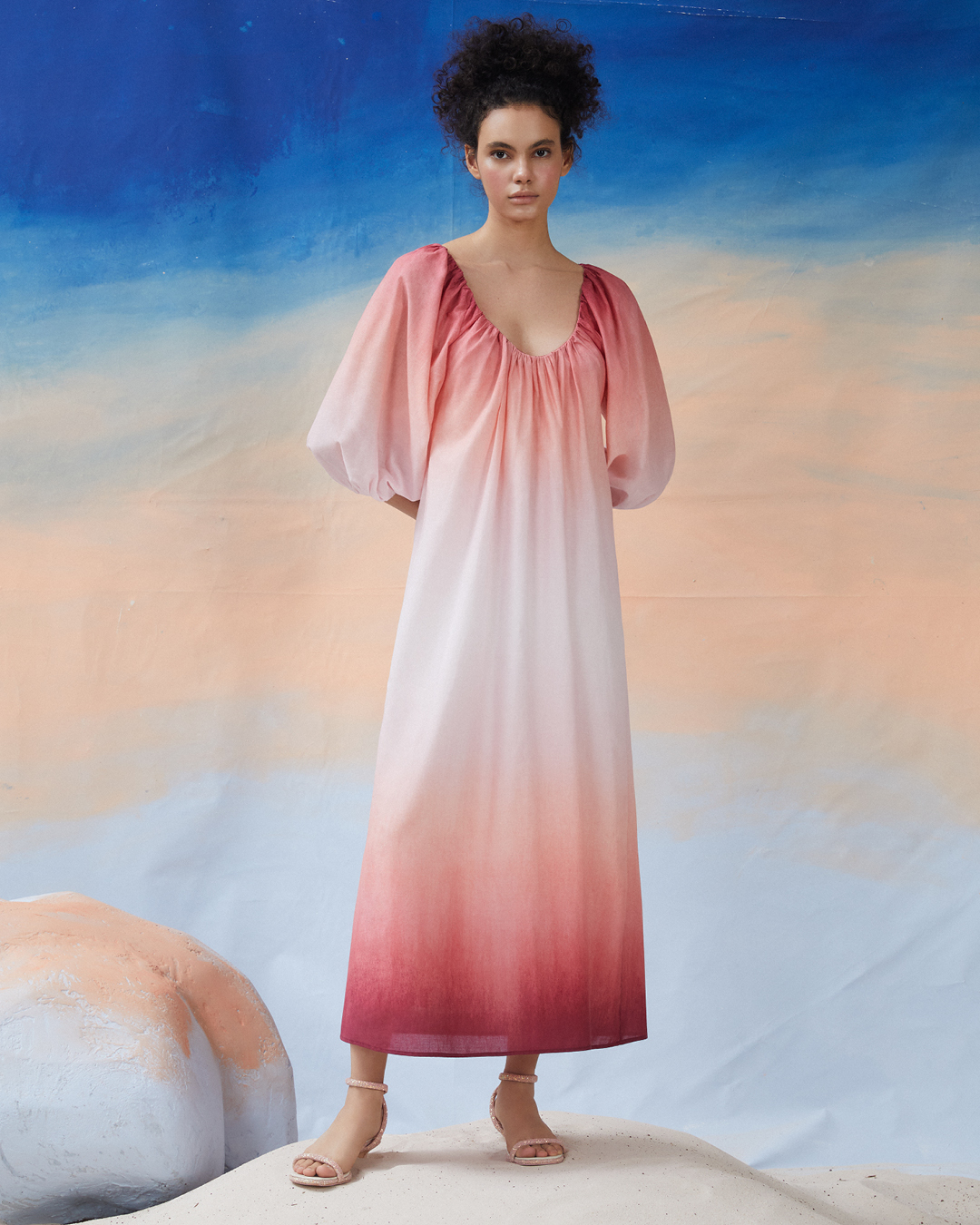Os dégradés da estampa Cápsula Sueños de Uyuni foram inspirados na cor do céu refletida no maior mar de sal do mundo, maravilha da natureza, o salar de Uyuni nos Andes Bolivianos. O degradê azul aparece no vestido de cetim com casaqueto, já o degradê bordô pode ser visto em duas opções mais diurnas: no vestido com mangas bufantes e no duo calça e camisa.