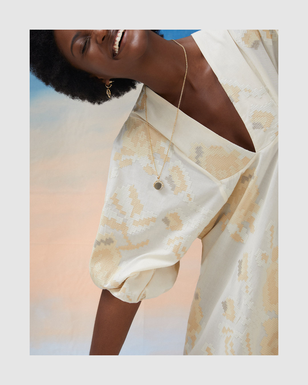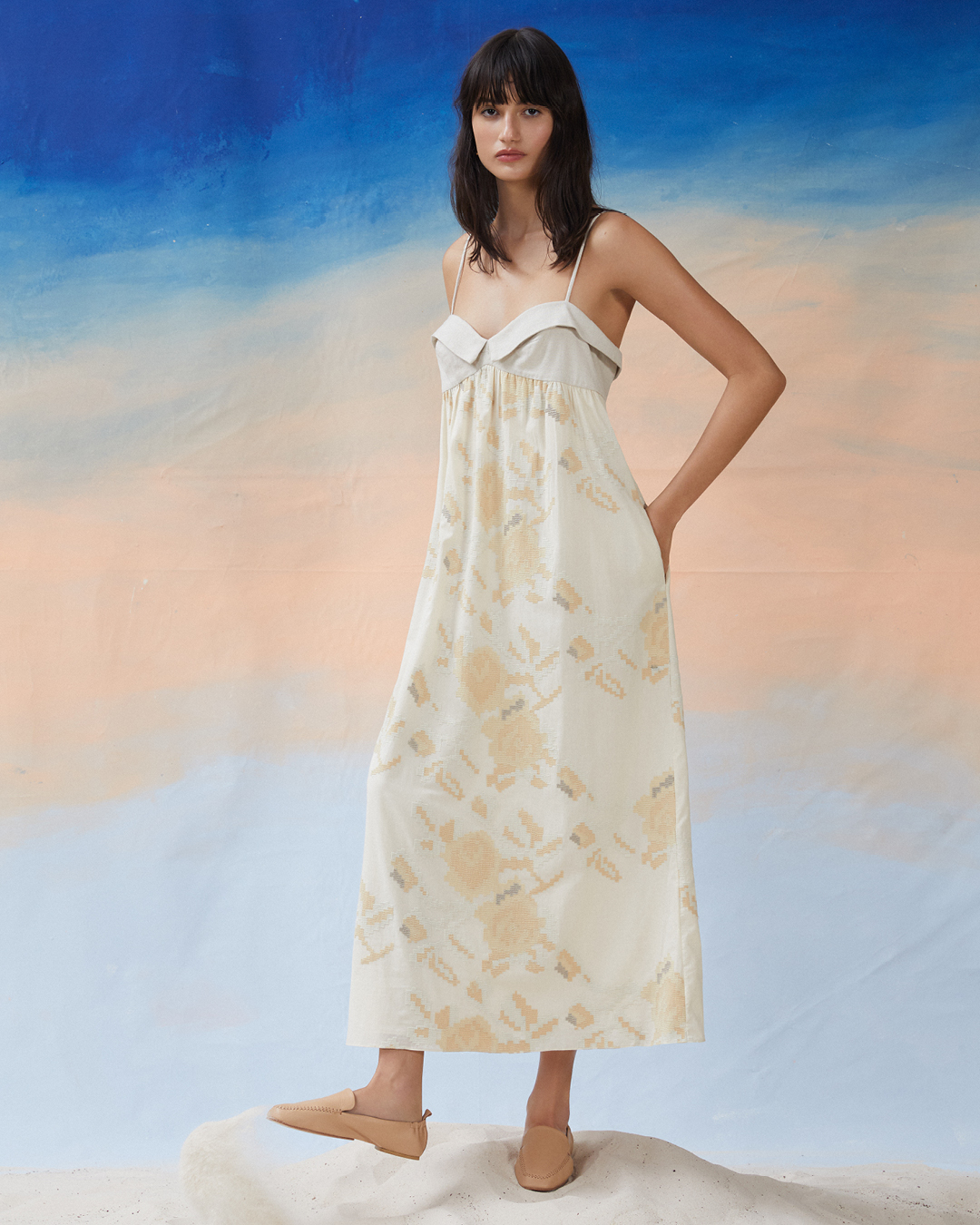 A Cápsula Hija de la Luna, encerra a coleção de verão com um ar leve e feliz trazendo o tecido Hermosa rico de bordados florais amarelados, que aparece em movimento na saia com pregas e nos vestidos de mangas bufantes e de alça fina. Destaque para o mocassim em couro bege e o cinto de couro branco com medalha statement.