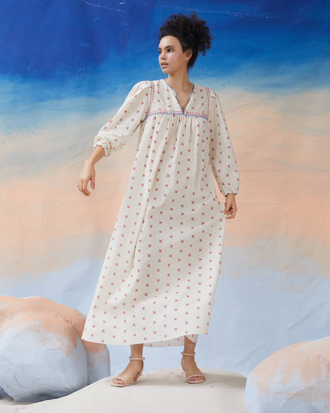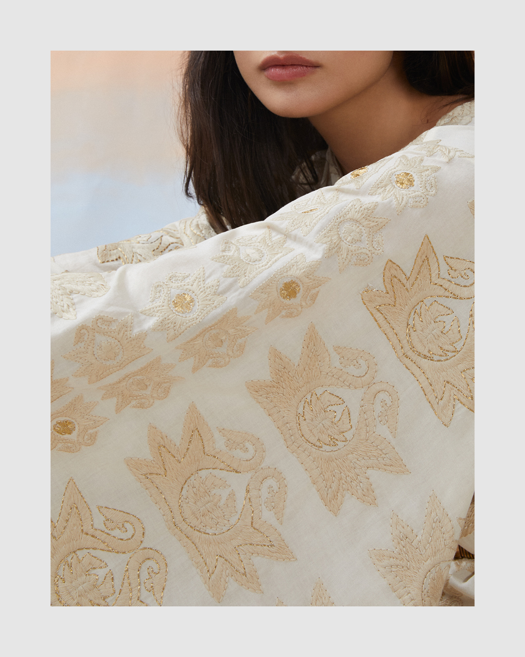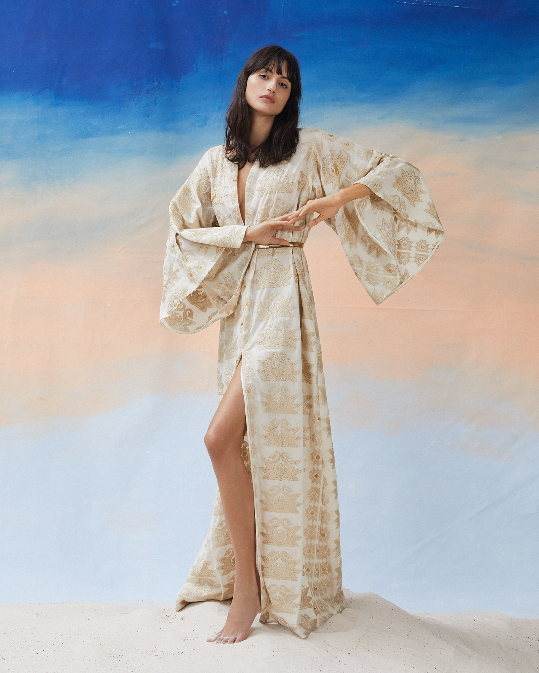 A Cápsula Los Astros chama a atenção para os looks perfeitos de réveillon, trazendo vestidos em off white com bordados manuais de flores e outros símbolos em pespontos dourados representando a riqueza das culturas latino- americanas. Três opções de vestidos longos aparecem nessa cápsula, um sem manga mais estruturado e justo ao corpo, outro com decote em V e costas abertas, e por último, o vestido desejo absoluto com mangas morcegos e cintura marcada.