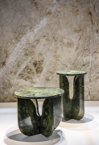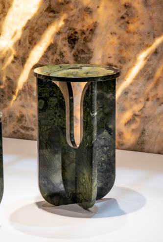 Outro destaque são as mesas Quartz, assinadas por Luciano Santelli, feita com sobras de Quartzito Vitória Régia.