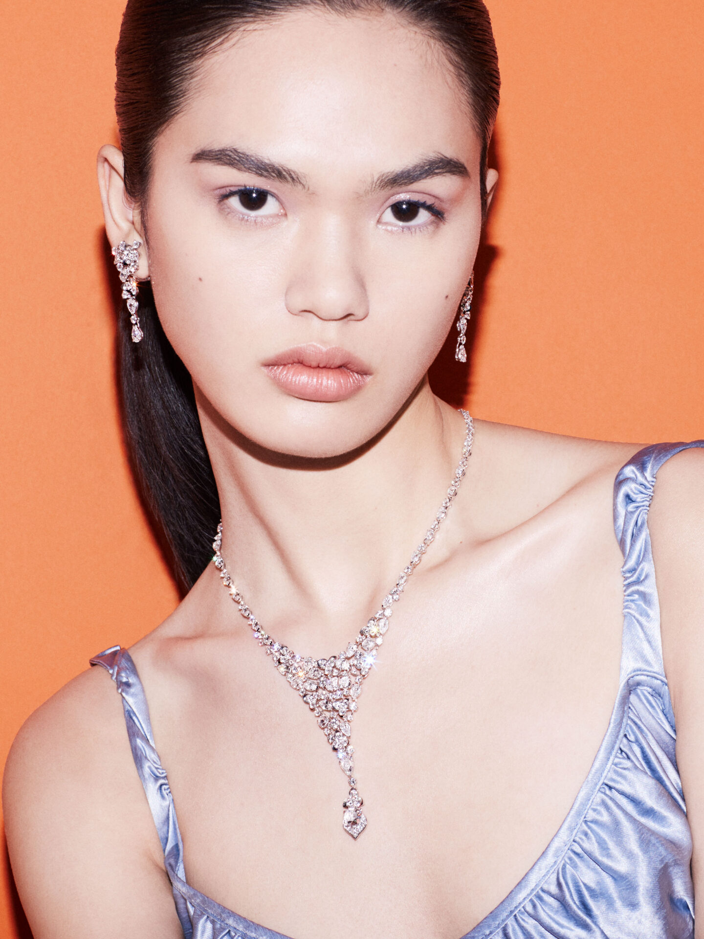 Como tal, cada imagem apresenta um toque de alta costura nas joias – um conjunto de brinco e colar de diamante branco fica ultra moderno quando estilizado com um vestido de seda inspirado nos anos 90; brincos de pérola se destacam em um vestido cor de tangerina; brincos cascata de diamante rosa combinados com um vestido rosa claro e óculos cor de rosa trazem o visual ‘combinandinho’ totalmente repaginado.