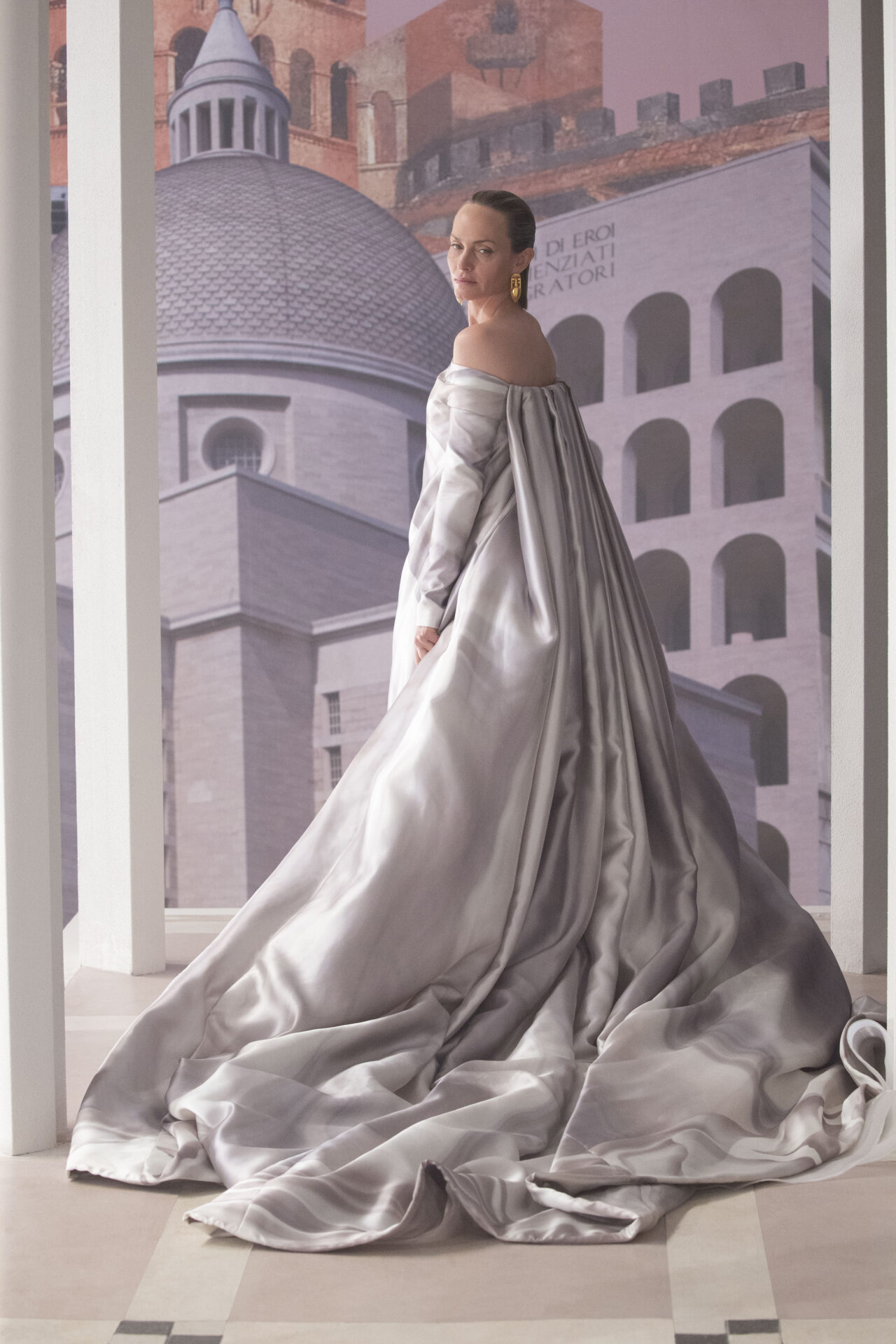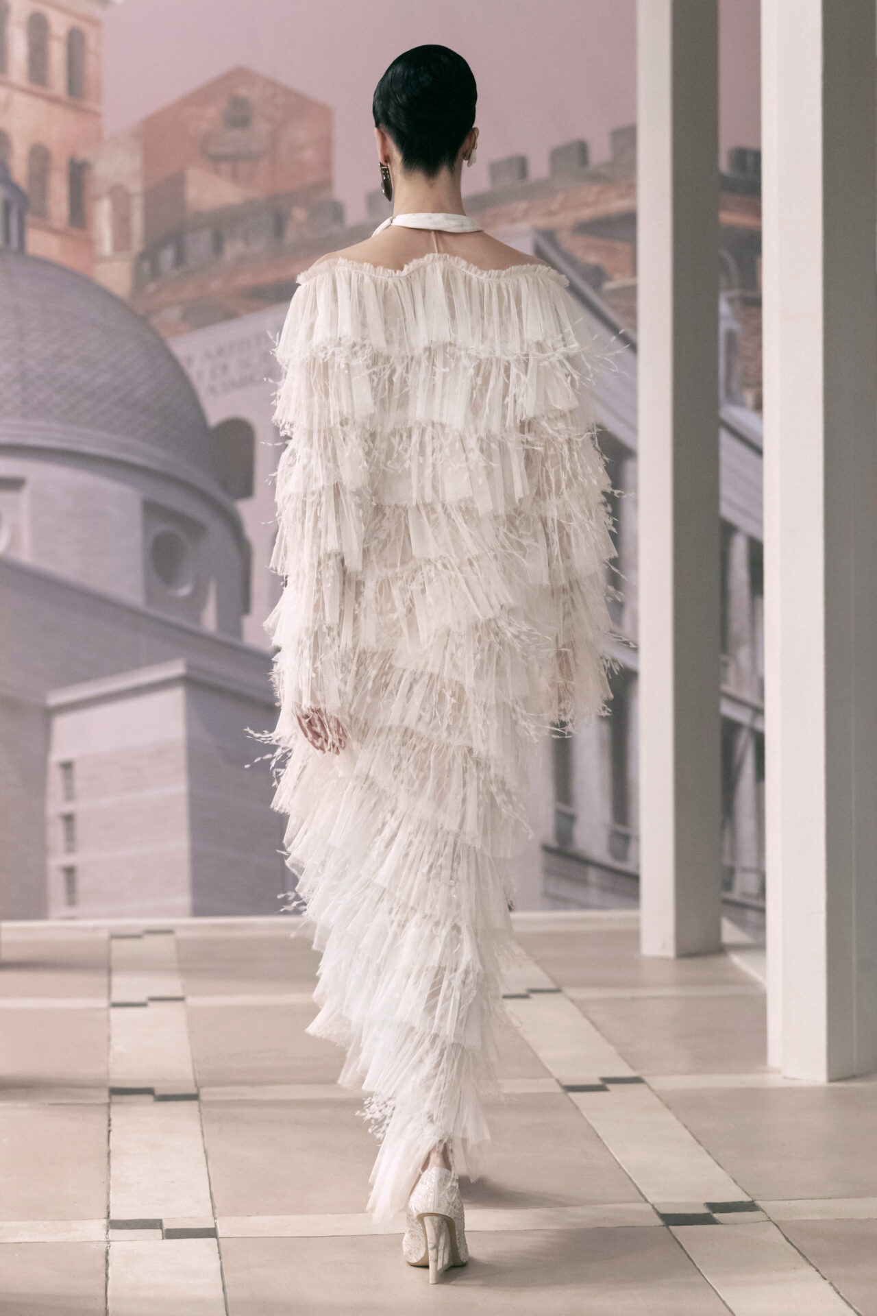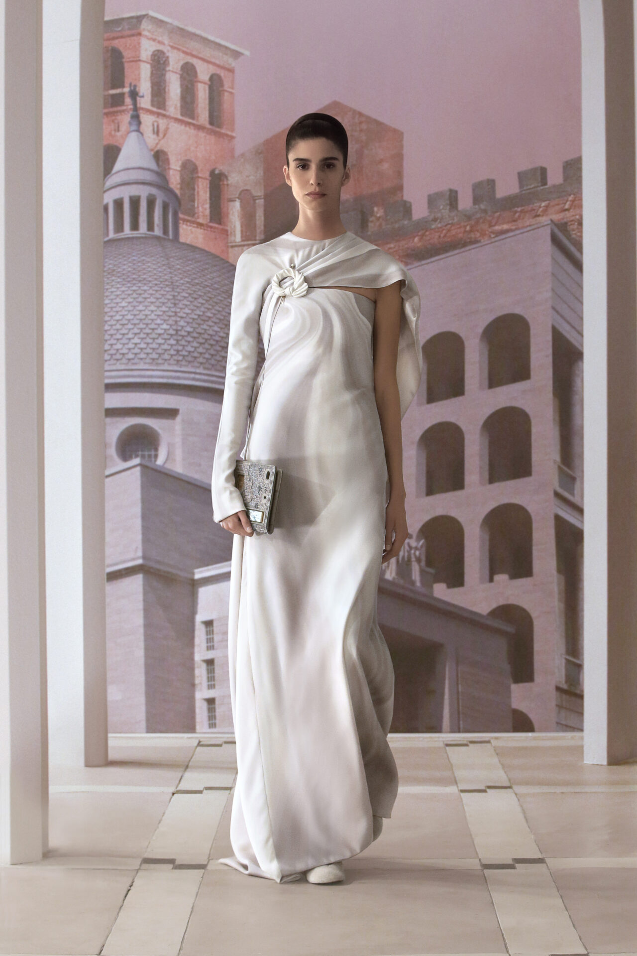 Temporalidades sobrepostas são mais diretamente expressas em peças que reanimam vestimentas antigas, suas peles e tecidos digitalizados e reprisados ​​como jacquards de seda fantasmagóricos. Inseridos em bordados Cornely e contas de cristal, eles localizam uma transfiguração poética do passado nos dias de hoje. Em outros lugares, a vida é soprada nas estátuas romanas que cercam o FENDI Palazzo, sua cortina de mármore agora expressa através de sedas trompe l’oeil e os arcos que habitam adaptados aos saltos dos sapatos. A força de suas silhuetas se traduz em delicados minivestidos de renda, onde volutas clássicas são conjuradas por meio de bordados intrincados.