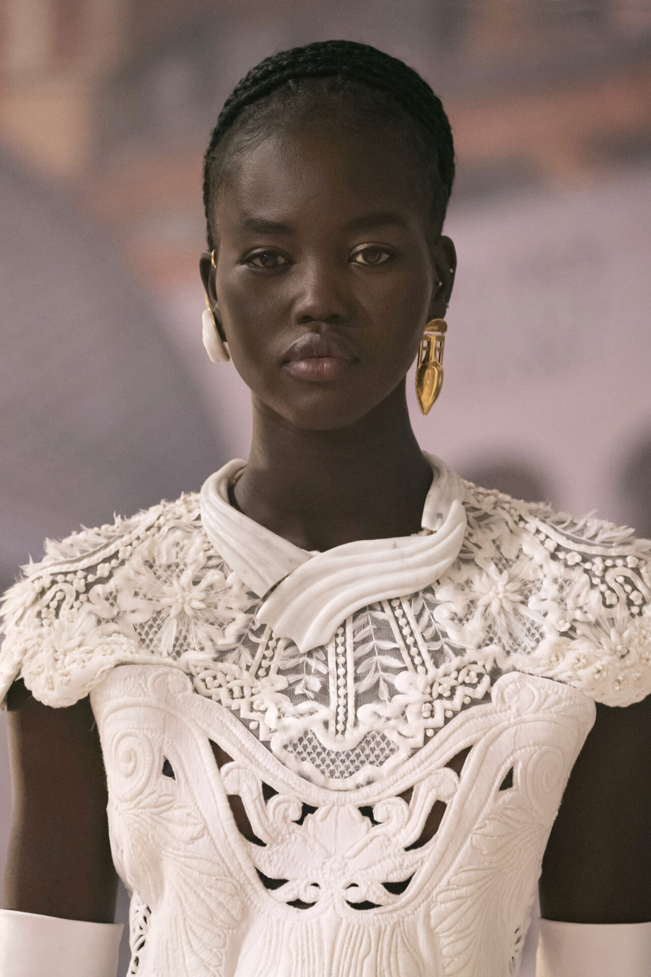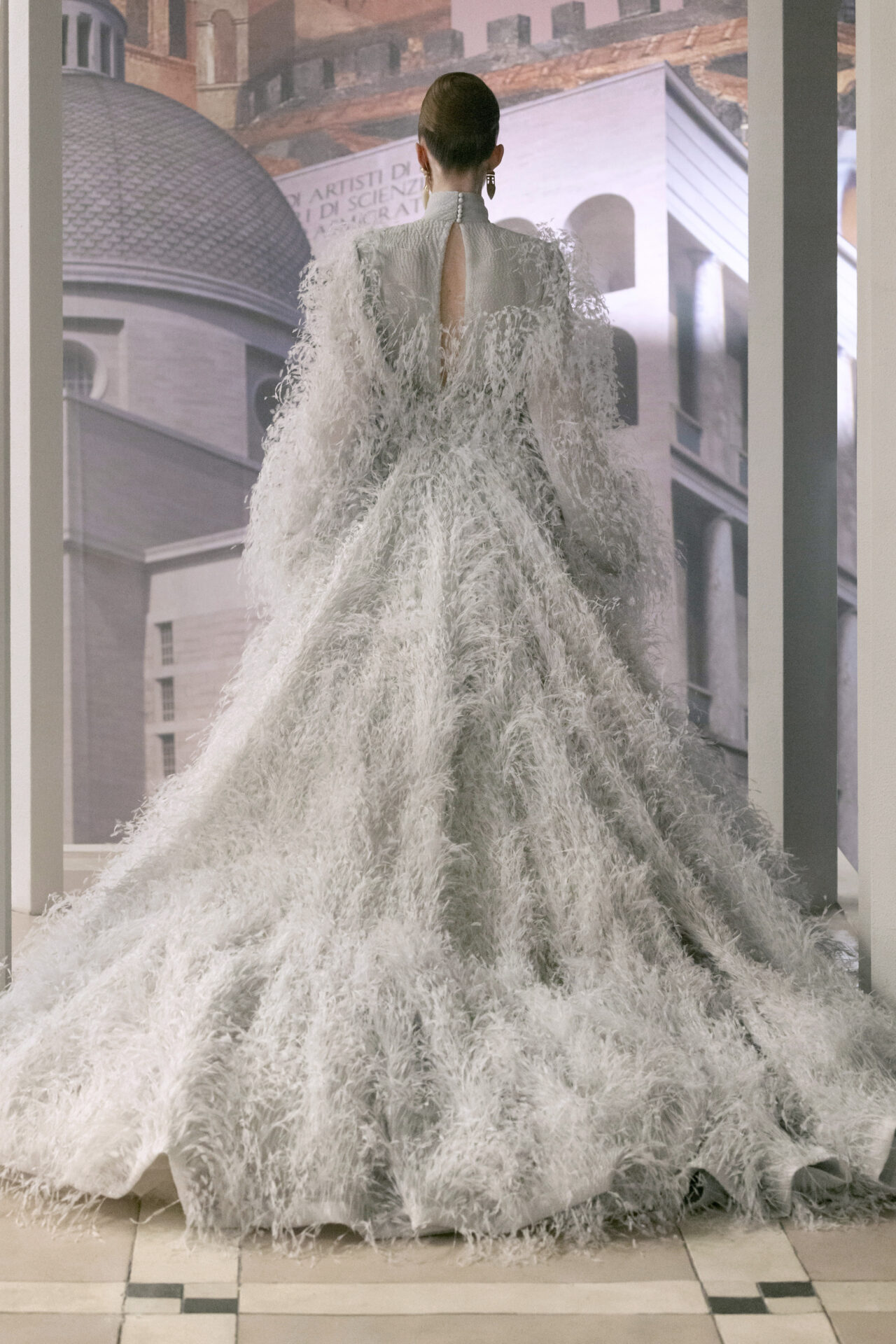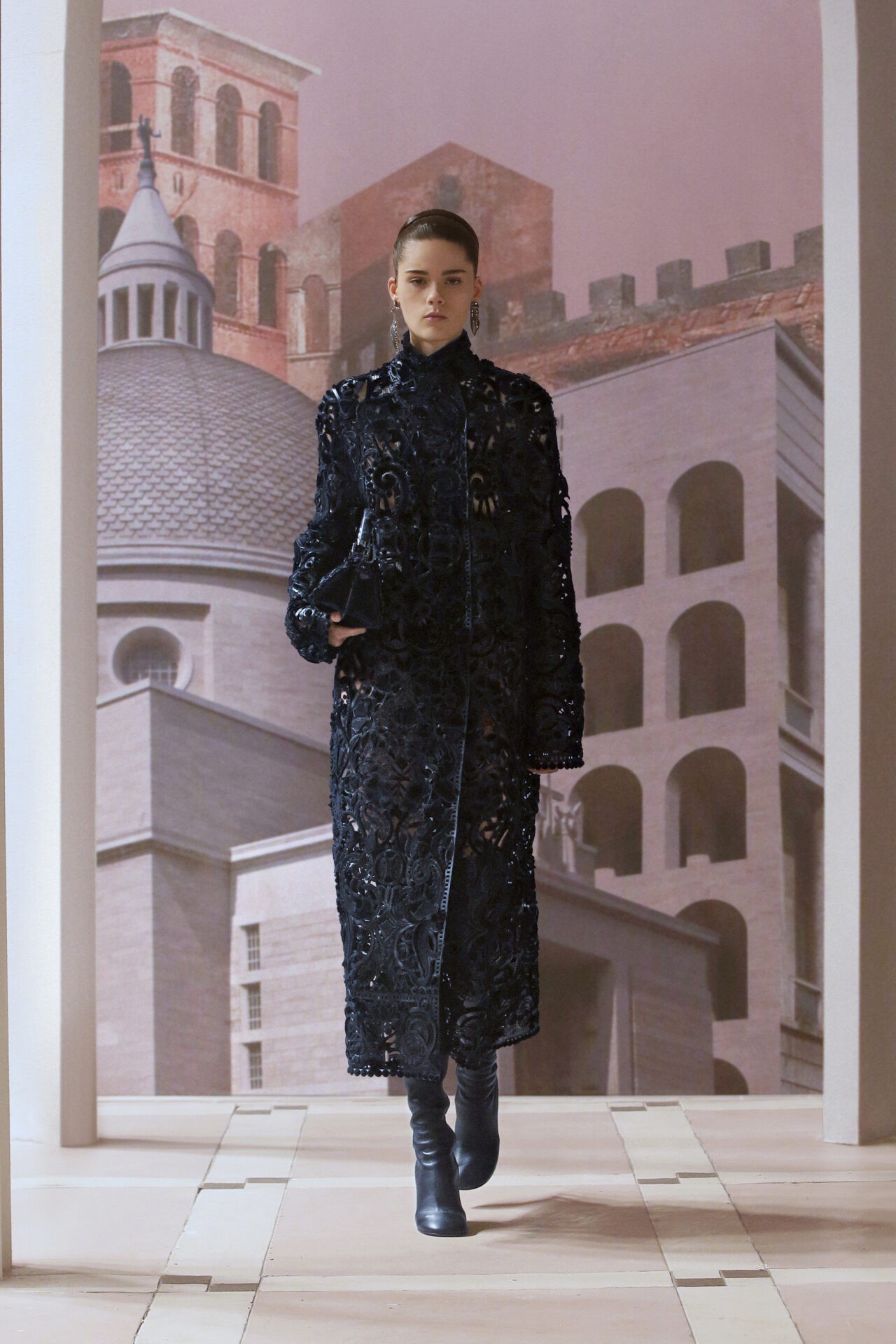 Temporalidades sobrepostas são mais diretamente expressas em peças que reanimam vestimentas antigas, suas peles e tecidos digitalizados e reprisados ​​como jacquards de seda fantasmagóricos. Inseridos em bordados Cornely e contas de cristal, eles localizam uma transfiguração poética do passado nos dias de hoje. Em outros lugares, a vida é soprada nas estátuas romanas que cercam o FENDI Palazzo, sua cortina de mármore agora expressa através de sedas trompe l’oeil e os arcos que habitam adaptados aos saltos dos sapatos. A força de suas silhuetas se traduz em delicados minivestidos de renda, onde volutas clássicas são conjuradas por meio de bordados intrincados.