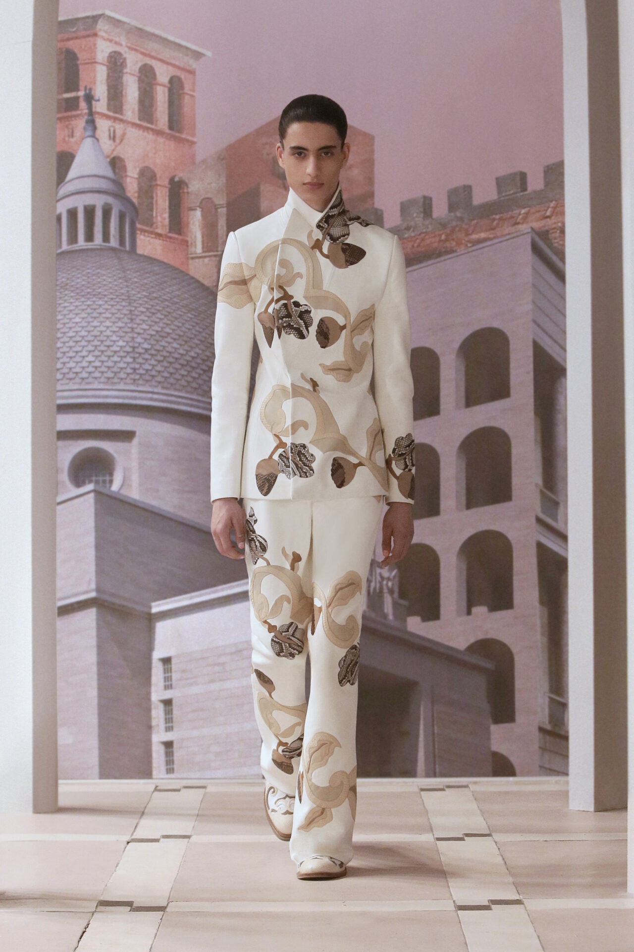 Se a estreia de Kim Jones Couture traçou sua transição da Inglaterra para Roma, então o outono / inverno de 2021 o vê se estabelecer na Cidade Eterna, onde a poética do cineasta romano Pier Paolo Pasolini apresenta uma lente para explorar a capital. “Roma é uma cidade fascinante porque tem tantos passados ​​- e me senti atraído por Pasolini porque sempre fui inspirado por sua visão do mundo”, explica Jones. “Ele é um estranho na história romana, mas cuja voz permanece constante.”