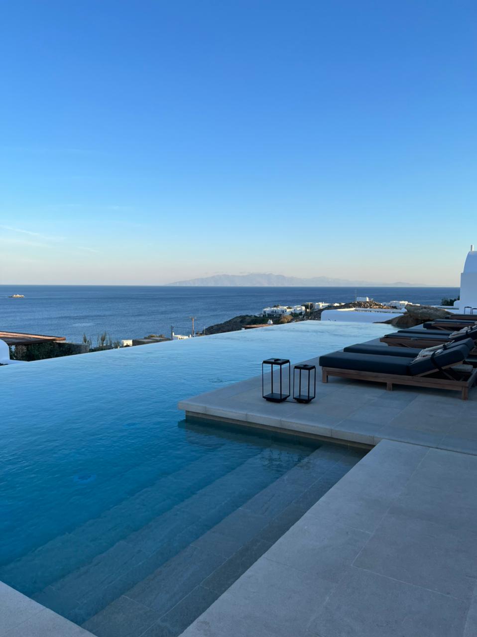 Mykonos tambem faz parte das ilhas Ciclades e dessa vez fizemos a viagem de ferry que tem 3h de duração em uma embarcação bem confortável. No porto um transfer já estava a nossa espera para nos levar ao ponto alto dessa viagem: conhecer o luxuoso Kalesma Mykonos. O hotel novíssimo, inaugurado em 2021, é sem dúvidas um dos melhores da ilha. As fotos encantam, mas nada se compara ao deslumbre de entrar pelo prédio branco e dar de cara com uma piscina de borda infinita maravilhosa. Idealizado com muito cuidado por Sofia Kousathana, Makis Kousathana e Aby Santiel, o Kalesma Mykonos foi pensado para que os visitantes se sentissem em casa.