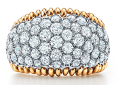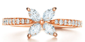 Foto: 01: Tiffany & Co. Schlumberger® Flower earring in 18k yellow gold and platinum with diamonds / 02: Tiffany Victoria® ring in 18k rose gold with diamonds / 03: Tiffany T True narrow ring in 18k rose gold with pavé diamonds, 3.5 mm wide / 04: Tiffany Victoria® alternating diamond band ring in 18k rose gold