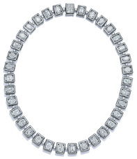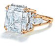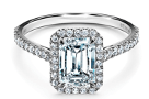 Foto: 01: Tiffany Soleste® emerald-cut halo engagement ring with a diamond platinum band / 02: Necklace in platinum with diamonds / 03: Tiffany Embrace® band ring in platinum with diamonds, 3.7 mm wide / 04: Tiffany Soleste® emerald-cut halo engagement ring with a diamond platinum band