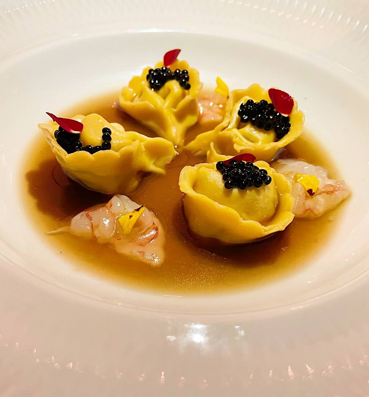 Para começar, Capesante al Champagne (Vieira glaceada perfumada com espuma de Champagne e infusão de dill). Em seguida, é servido o Calamari ripieno con pancetta Al Sugo affumicato (Lula recheada de panceta artesanal, polvo e maçã banhada com sugo de tomates defumados).