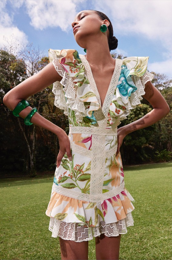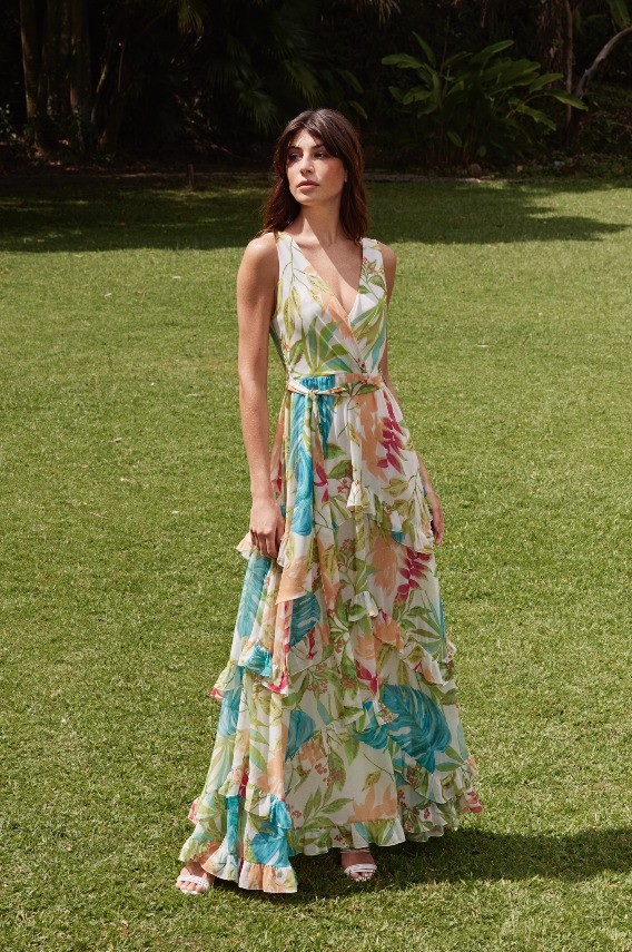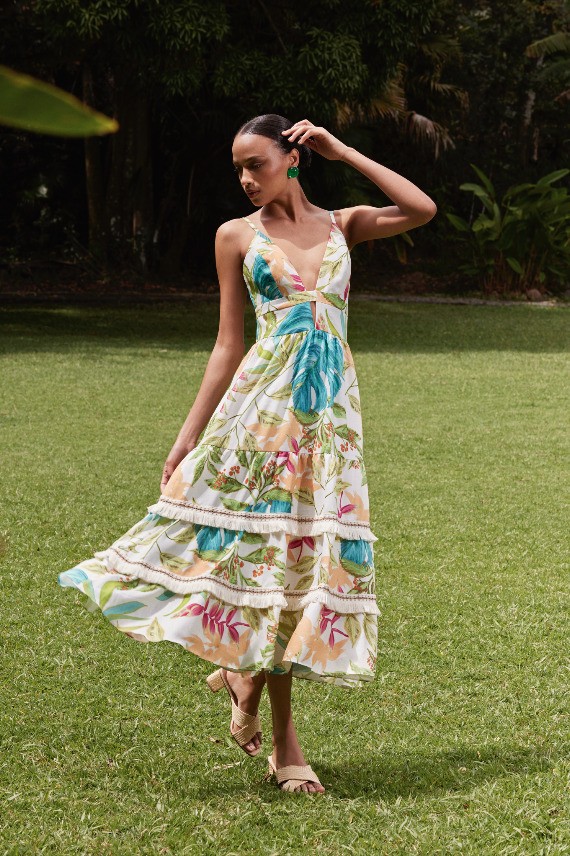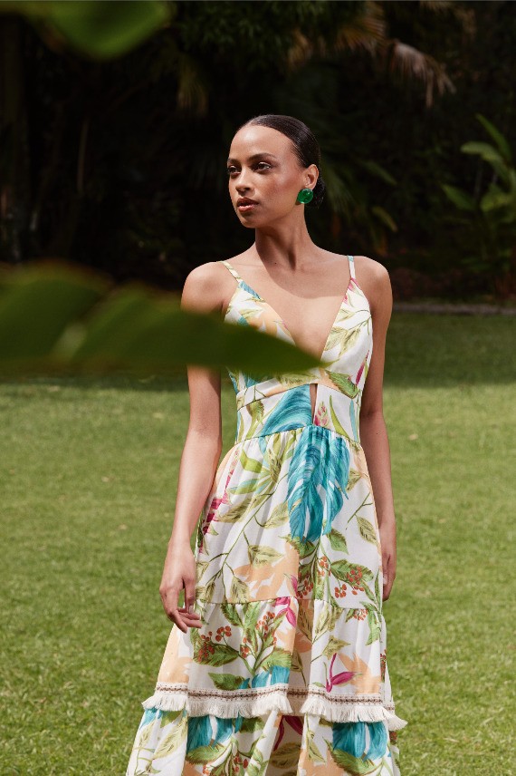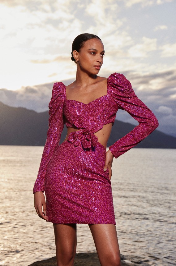 A mistura de ideias, texturas e combinações improváveis possibilita o encontro perfeito entre a festa e a praia. Afinal, é nesse mix onde a coleção ganha ainda mais força. A predominância das décadas de 60 e 70 acontece com influência, evidenciada pelo protagonismo das cores. O pink, nomeado Bubble Gum, mais uma vez aparece com destaque, ora sozinho, ora contrastado com o tom vibrante Cherry Pop, em tecidos nobres como o zibeline, remetendo a uma alfaiataria poderosa. Nas modelagens, mangas extras volumosas roubam a cena em vestidos, bodies e tops. O brilho dos paetês aparece em variações belíssimas de vestidos e colorações, garantindo uma festa cool, atual e com ares fresh. Estampas que remetem à fauna e flora, como a Tropicália, e que rendem belas peças nos shapes característicos da marca em vestidos fluídos e leves. Contrastando-se a tantas cores, a estampa Bem-me-quer traz uma das flores favoritas de Patricia Bonaldi, a margarida, em criações cheias de significado.