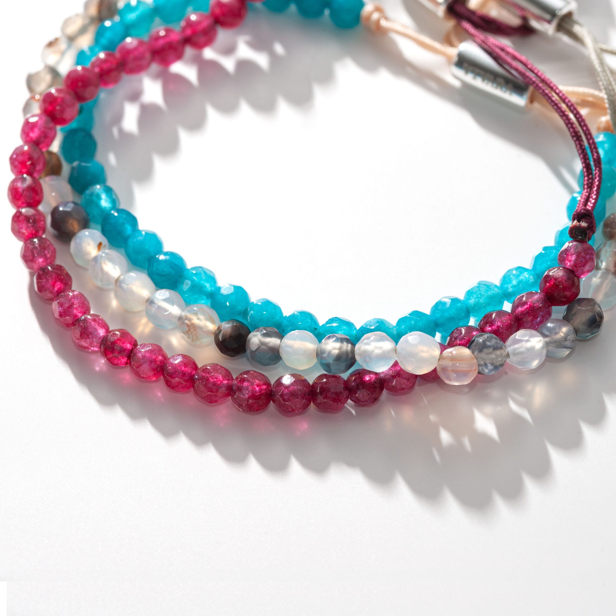 Com estilo delicado e moderno, as shambalas são consideradas um amuleto capaz de transmitir paz, proteção e tranquilidade de acordo com a energia de cada um. Nessa coleção, foram utilizadas as pedras Ágata, Jade Azul e Jade Vermelha.