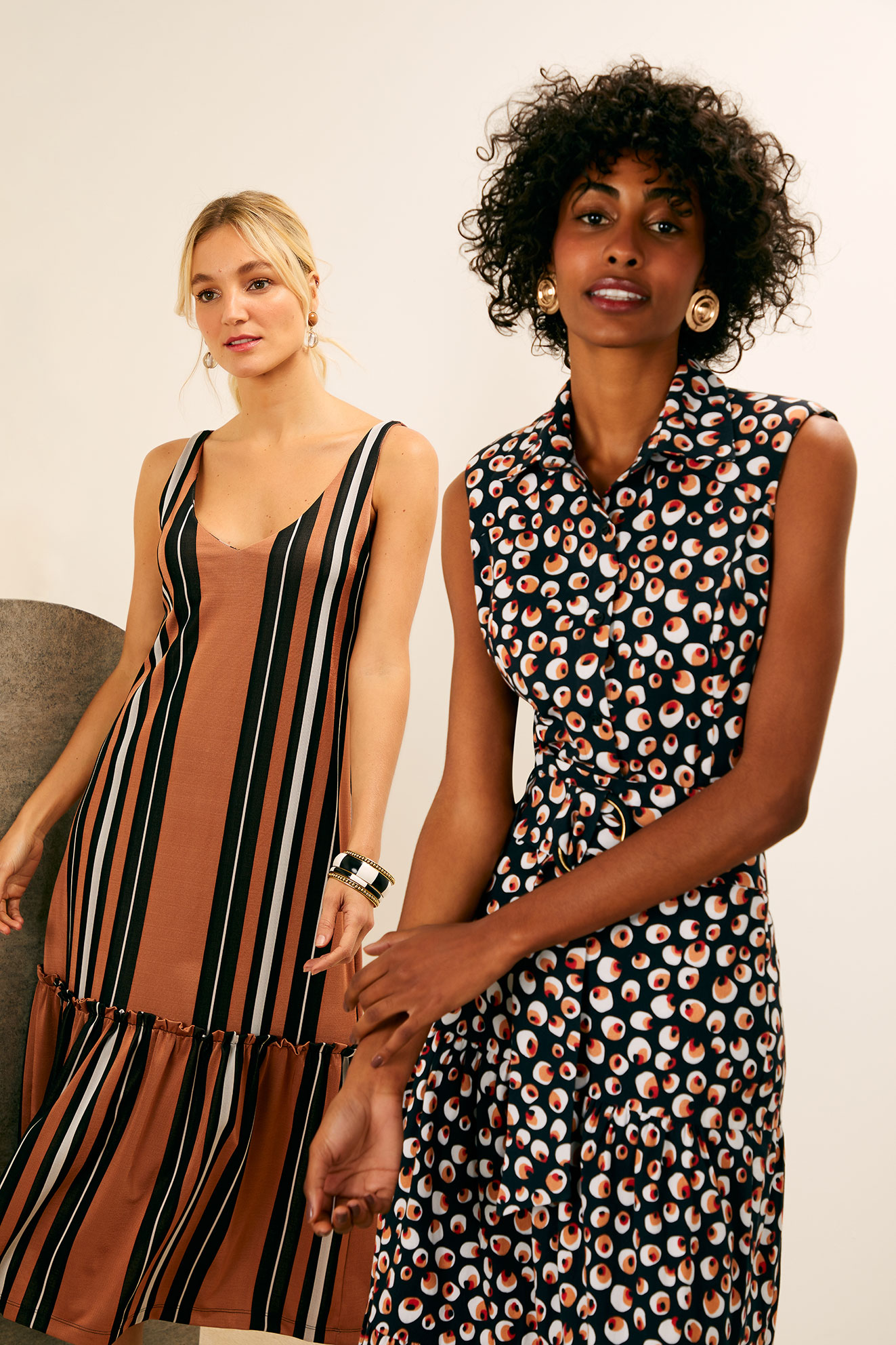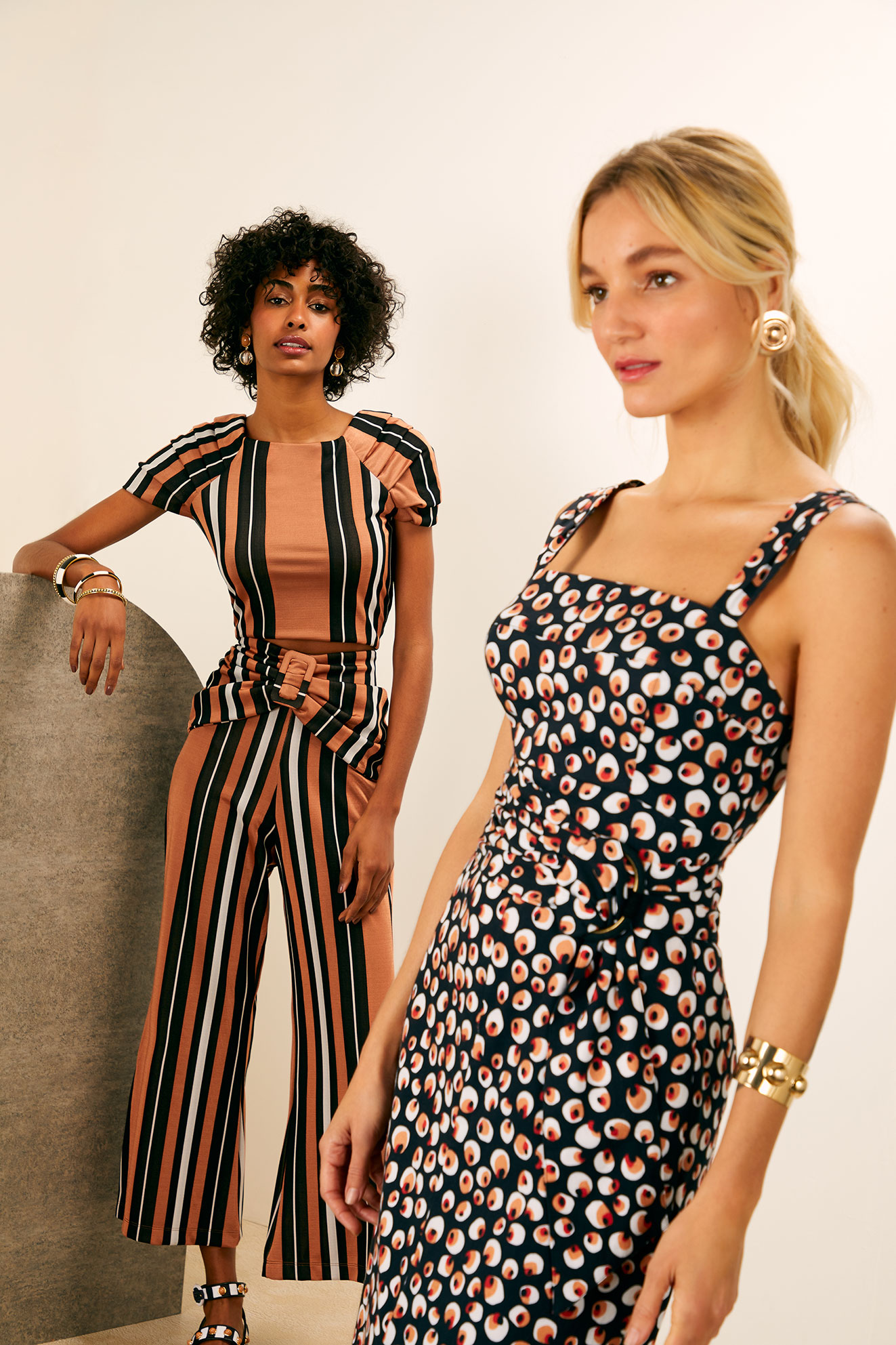 DUO traz modelagens e shapes clássicos de Maria Filó, como cintura marcada, tecidos fluidos, recortes estratégicos e amarrações. As peças são versáteis, atemporais e femininas, seguindo o DNA da marca.