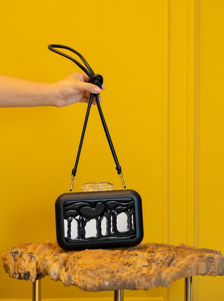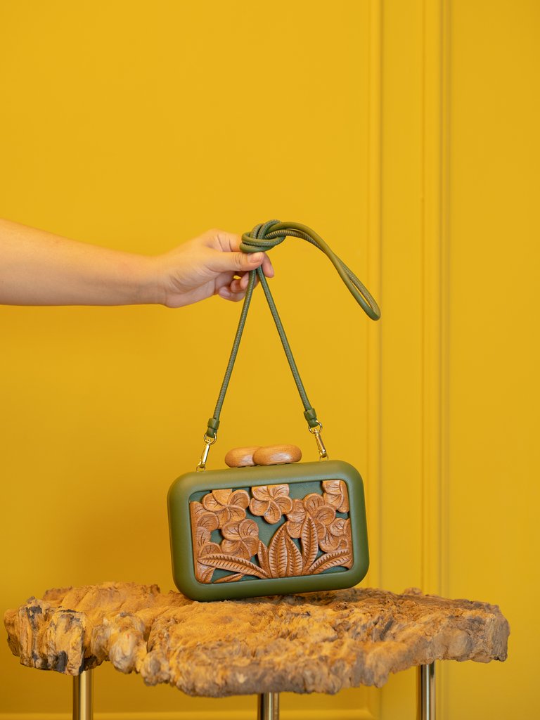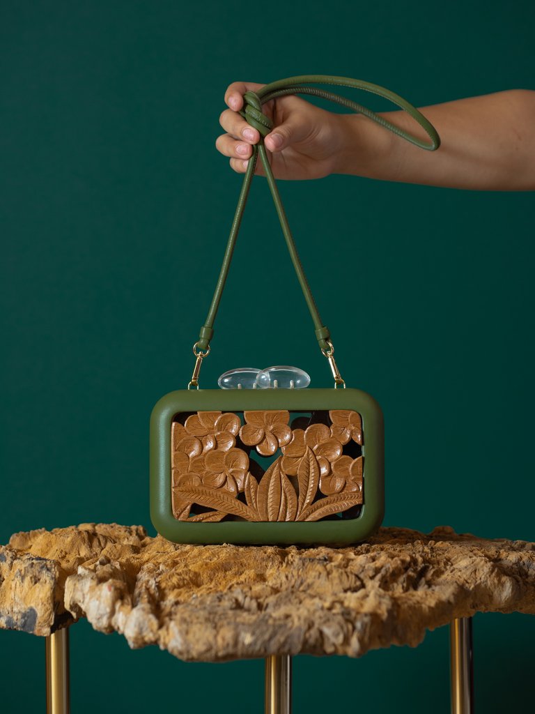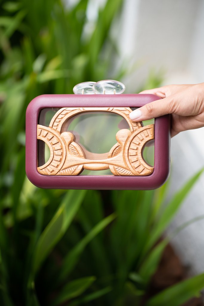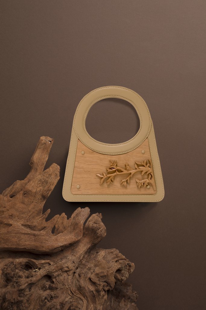 A pièce de résistance da coleção é a madeira entalhada – lixada, encerada ou ao natural – cuidadosamente combinada com materiais que realçam e contrastam com a técnica milenar – acrílico, folha de cobre, areia, espelho, couro, entre outros. A alça removível em couro imprime versatilidade às bolsas, permitindo serem usadas descontraidamente ao longo do corpo, crossbody ou como clutch.