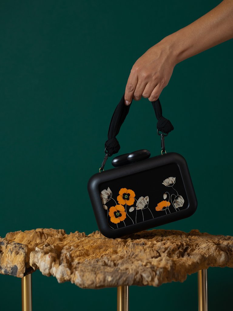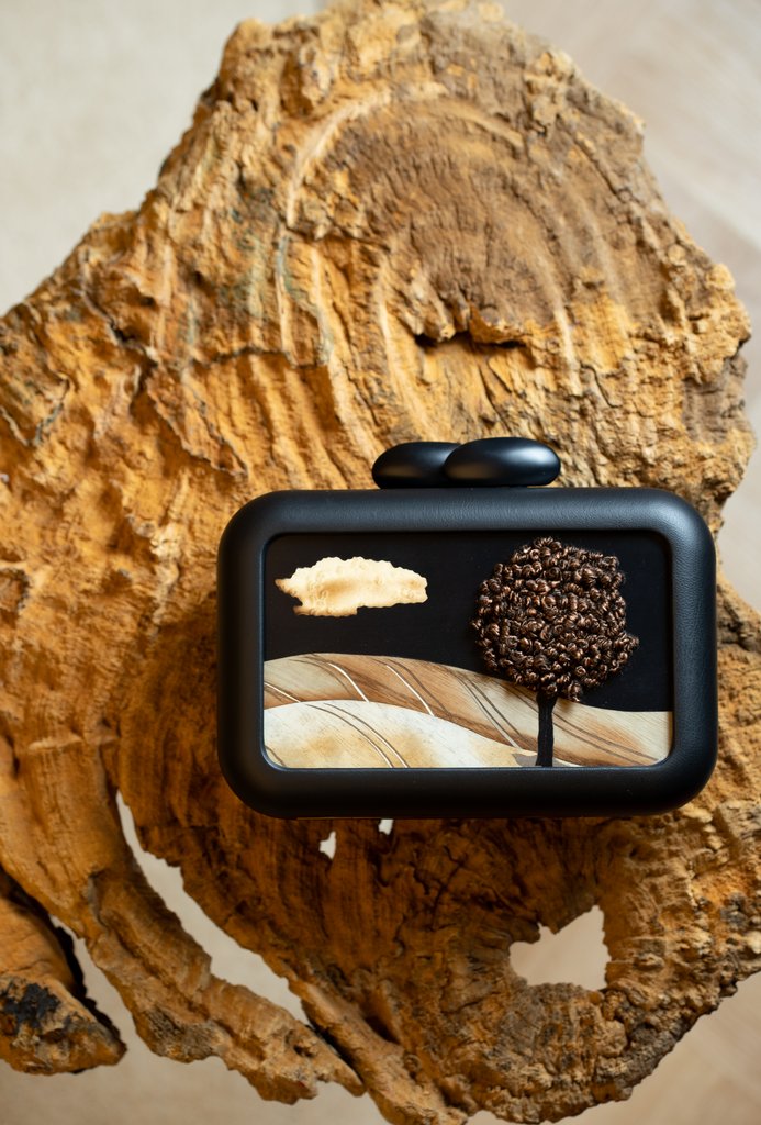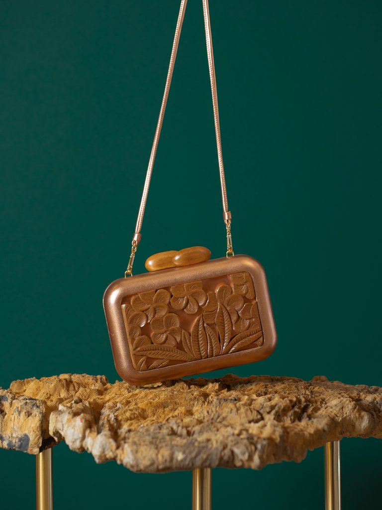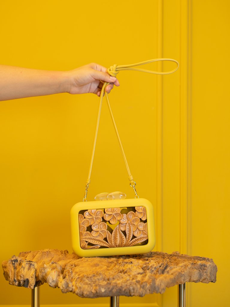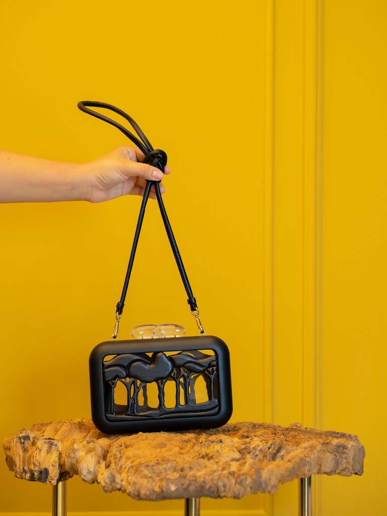A pièce de résistance da coleção é a madeira entalhada – lixada, encerada ou ao natural – cuidadosamente combinada com materiais que realçam e contrastam com a técnica milenar – acrílico, folha de cobre, areia, espelho, couro, entre outros. A alça removível em couro imprime versatilidade às bolsas, permitindo serem usadas descontraidamente ao longo do corpo, crossbody ou como clutch.