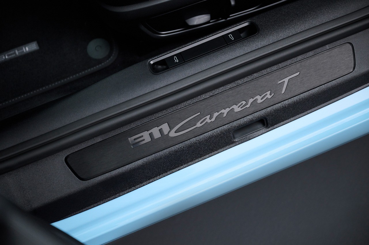 A Porsche está ampliando a família 911 com o veículo esportivo leve, o 911 Carrera T. A letra “T” significa touring (passeio) e descreve modelos que oferecem uma experiência de condução purista e configurações excepcionalmente esportivas. Como exemplo, os bancos traseiros foram omitidos na busca pela redução de peso. O novo 911 Carrera T é também equipado com uma suspensão esportiva PASM com abaixamento de 10 mm e isolamento acústico reduzido. O modelo é epitome do purismo e exalta o prazer de dirigir. A experiência sonora recebeu tratamento especial: o som do motor boxer de seis cilindros ganhou uma presença ainda mais marcante no interior.
