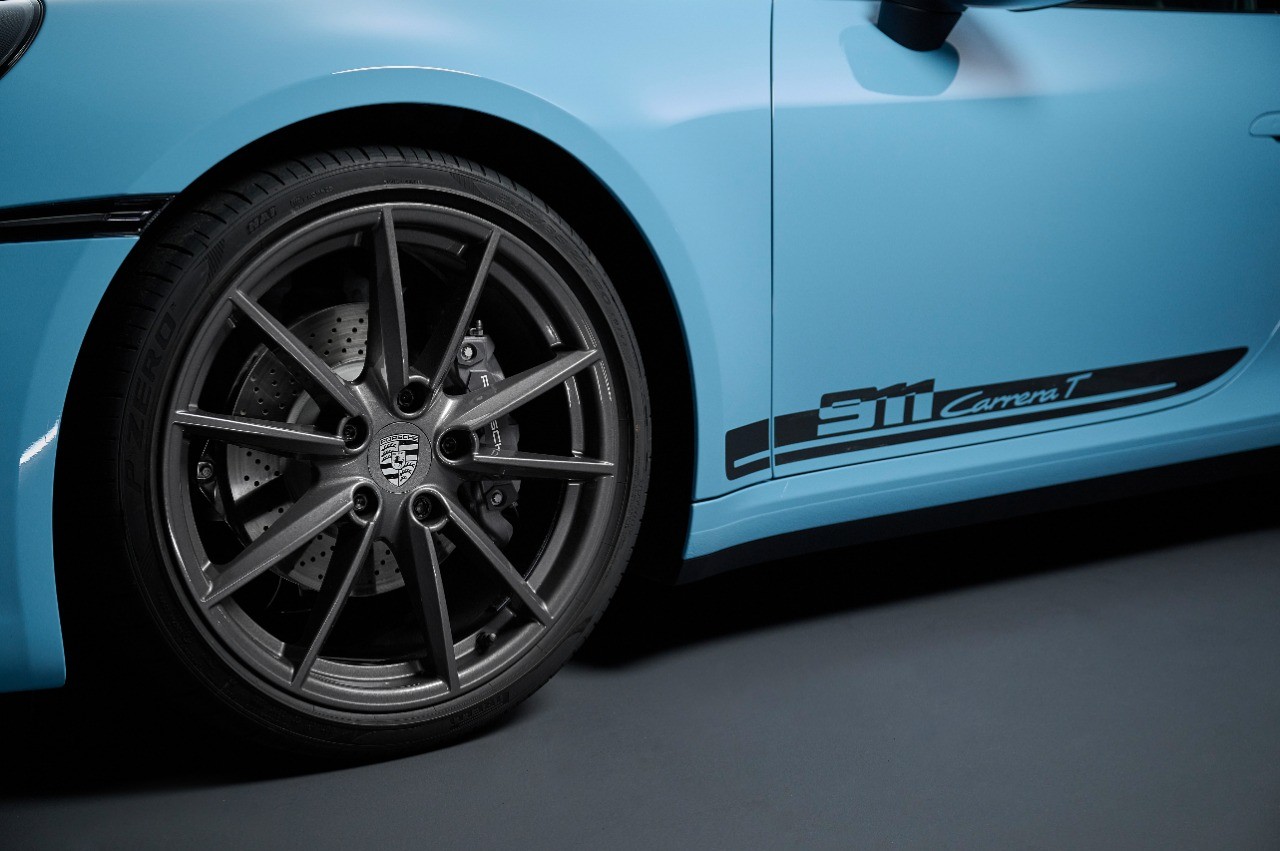 Na parte externa, o Porsche 911 Carrera T dos demais modelos da linha 911 com detalhes marcantes em Cinza Escuro. Elementos contrastantes como o acabamento superior e inferior nos espelhos externos, os novos logos na porta e os logos traseiros, bem como as faixas decorativas na grade da tampa traseira em Cinza Ágata. O para-brisa também apresenta a coloração cinza na parte superior. As saídas do sistema de escape esportivo são em preto de alto brilho. Tudo isso confere ao novo 911 Carrera T uma aparência ainda mais extrovertida e dinâmica.