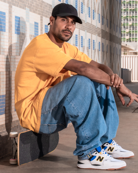 O modelo – inspirado pela herança dos anos 90 e pela reputação técnica da marca no esporte – não poderia ser melhor representado, já que a NB considera Tiago o melhor skatista do mundo, dono de uma técnica e estilo únicos no street, assim como o tênis que assina.