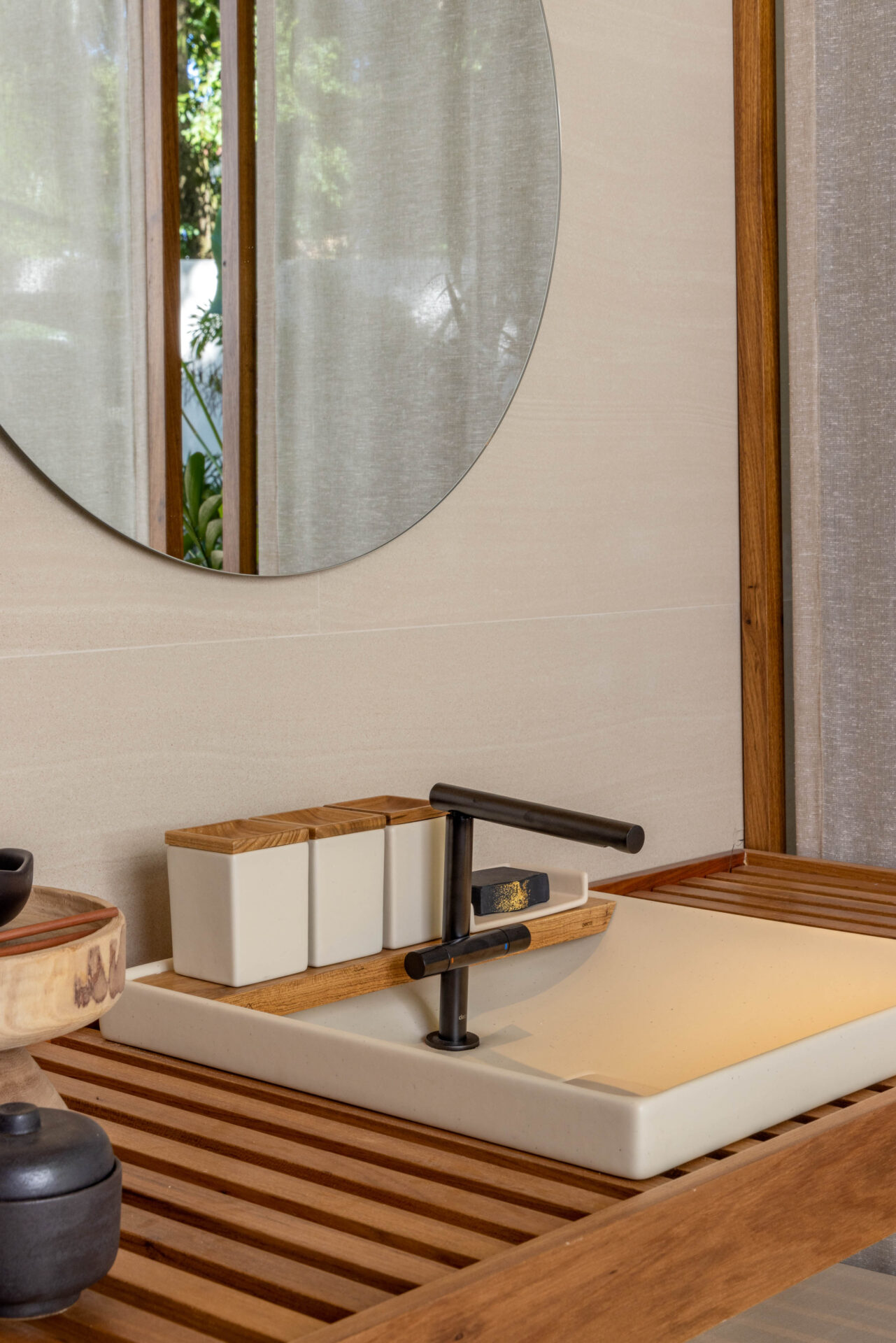 “E essas novidades foram fundamentais na criação do SPA Deca na CASACOR 2022. No projeto, incluímos a cuba Arthur Casas, que traz um design mais orgânico e remete a um produto mais artesanal, natural, que conversa com nossa proposta de ambiente integrado com a natureza. Além disso, traz uma bandeja com kit de acessórios que mantém, de forma prática e elegante, os itens organizados na bancada “.