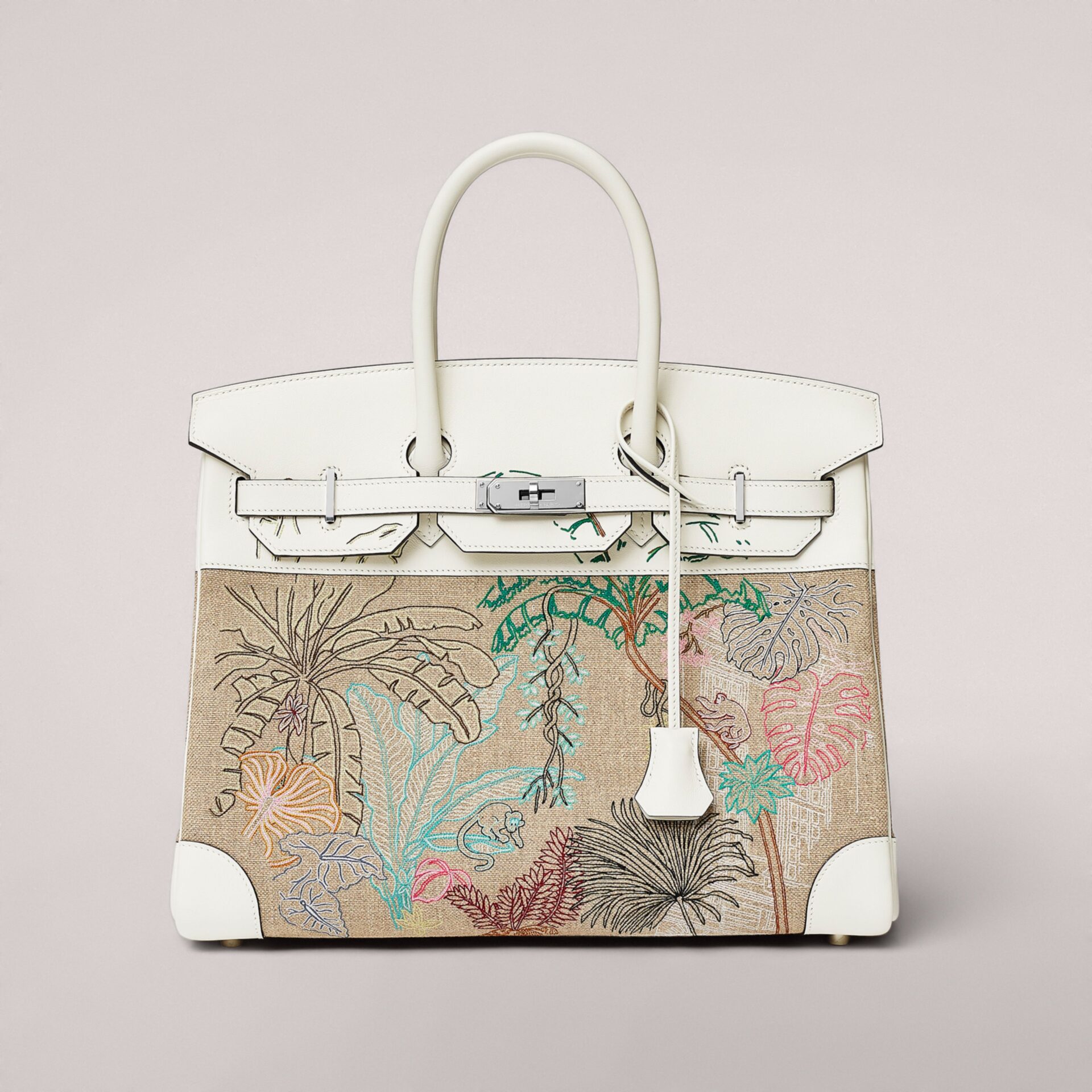 Birkin narra sua história com virtuosismo: o design imaginado pela dupla criativa Octave Marsal e Théo de Gueltzl, e bordado em ponto de Lunéville, mergulha a loja emblemática do Faubourg Saint-Honoré no coração de uma selva exuberante. A façanha suprema: o design é permeado na aba de couro e no fundo da bolsa.