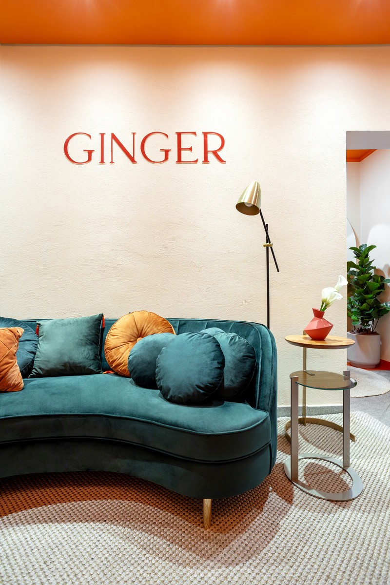 O espaço imprime criatividade, conforto e toda escolha foi inspirada na personalidade fashionista e empreendedora de Marina e nos diferentes perfis da mulher “Ginger” – tudo com uma estética vibrante, artística e que evidencia o famoso tom laranja.