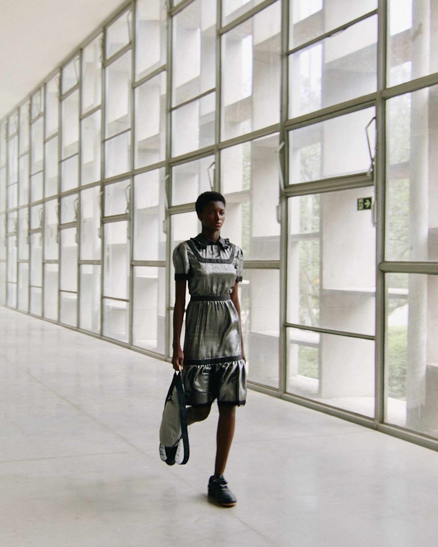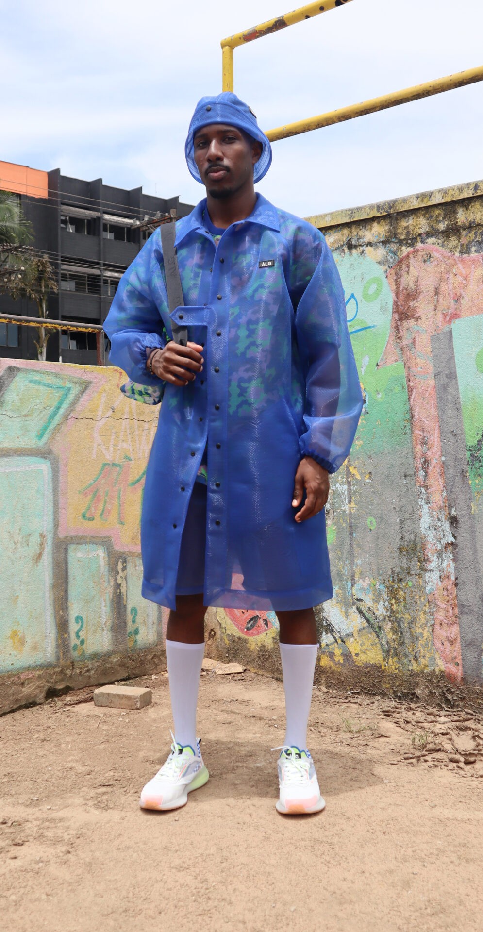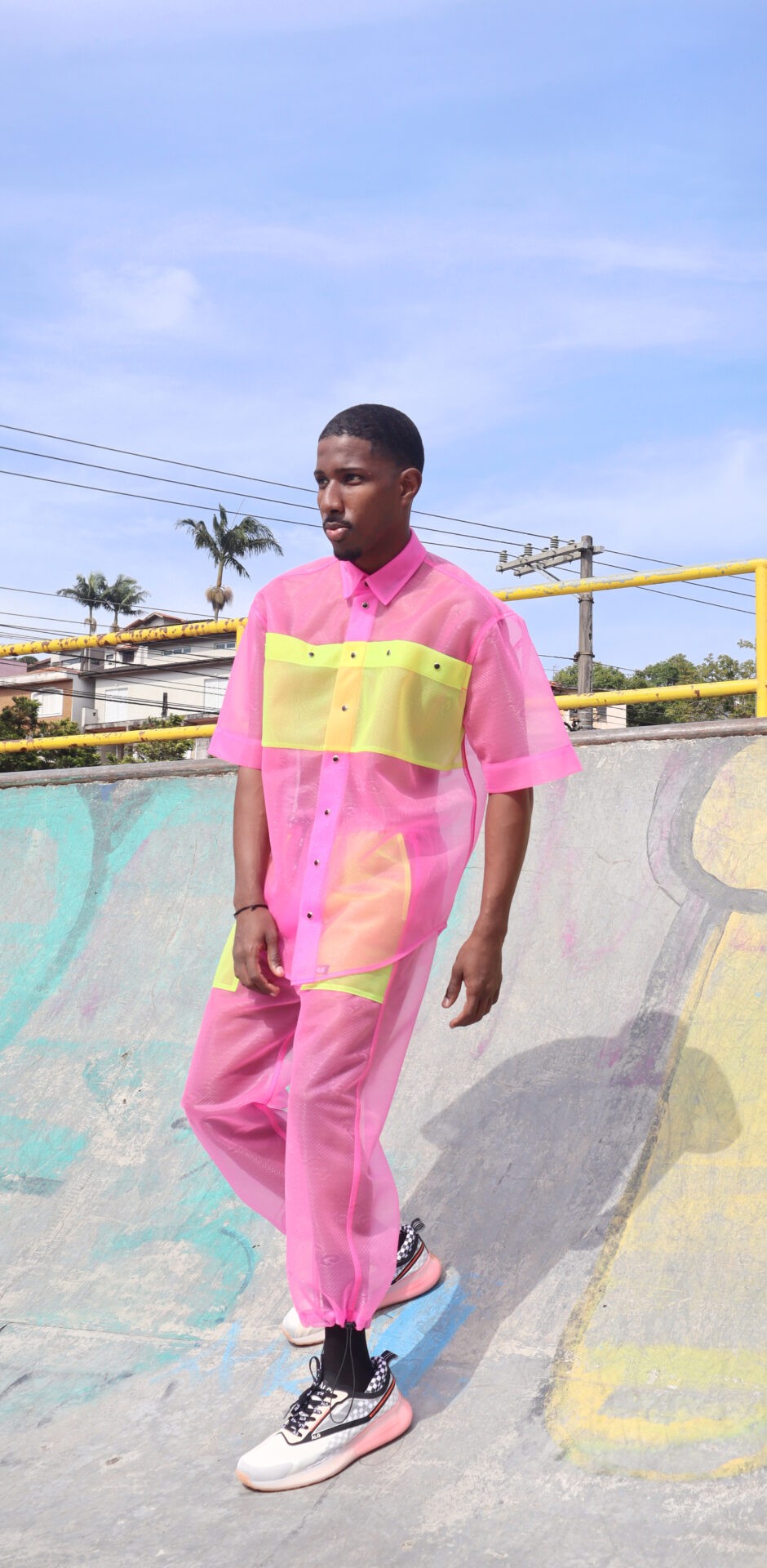“Essa foi uma coleção que comecei a desenhar a partir da matéria prima”, diz Alexandre Herchcovitch. Desenvolvemos um material com nosso parceiro Branyl , que é extremamente leve, transparente e que não é fluído, daí então reproduzimos os best sellers da marca neste tecido transparente de alta tecnologia e que originalmente era destinado a calçados, fizemos mudanças na trama e na maciez para que pudesse ser vestível. Além da transparência, o material permite a troca de ar interno e externo quando vestido. Tênis Manobra desenvolvido em parceira com Olympikus completa todos os looks.