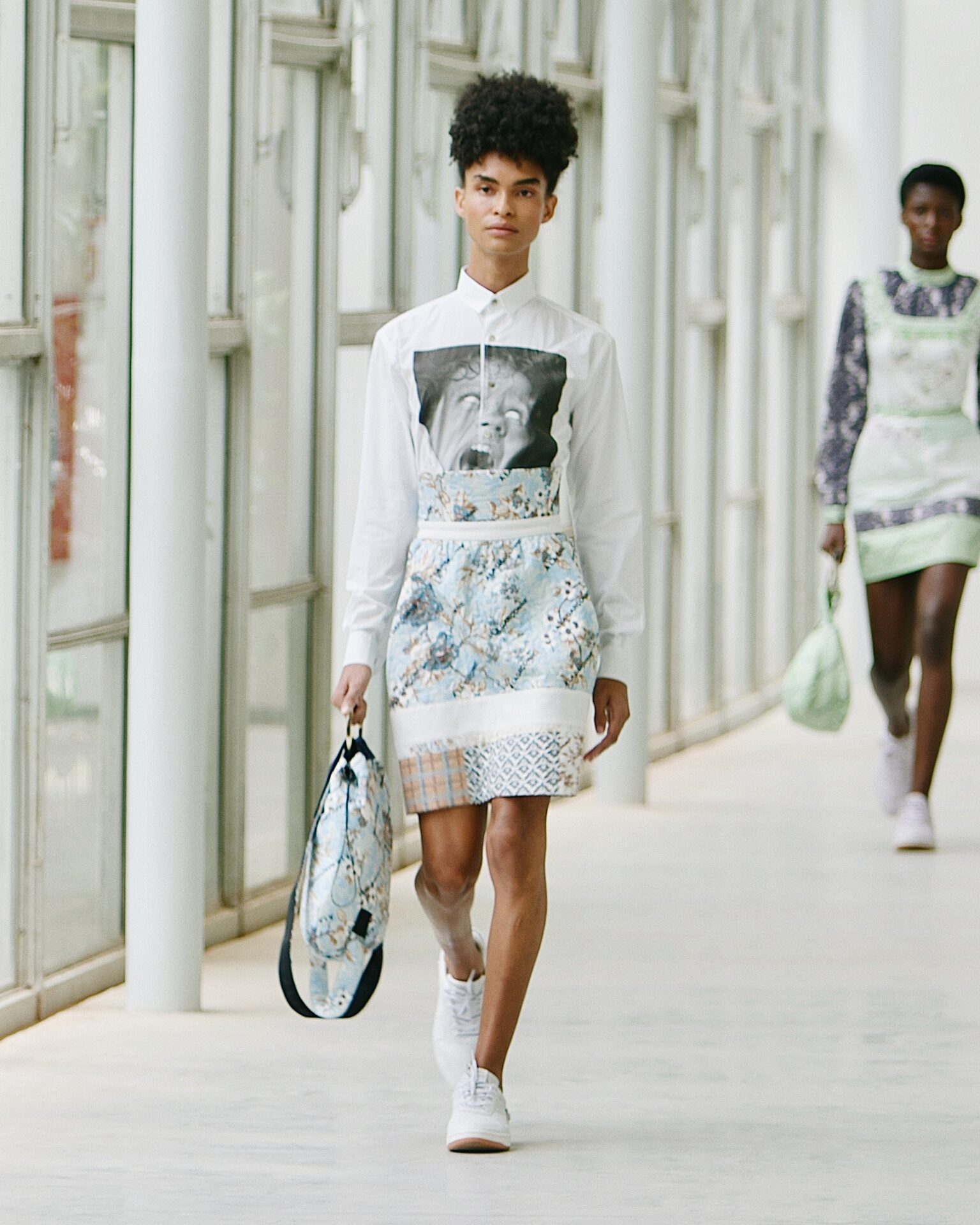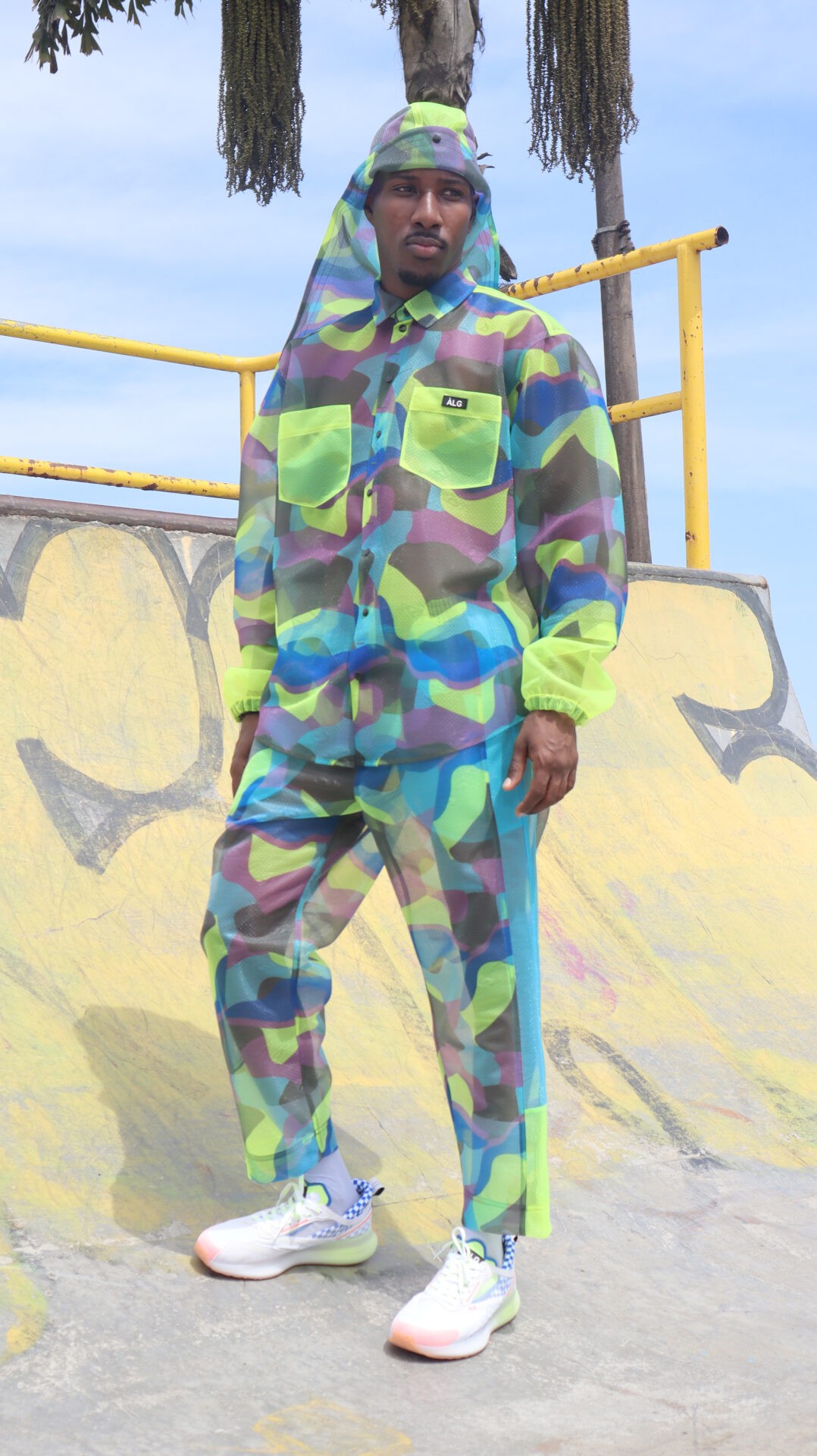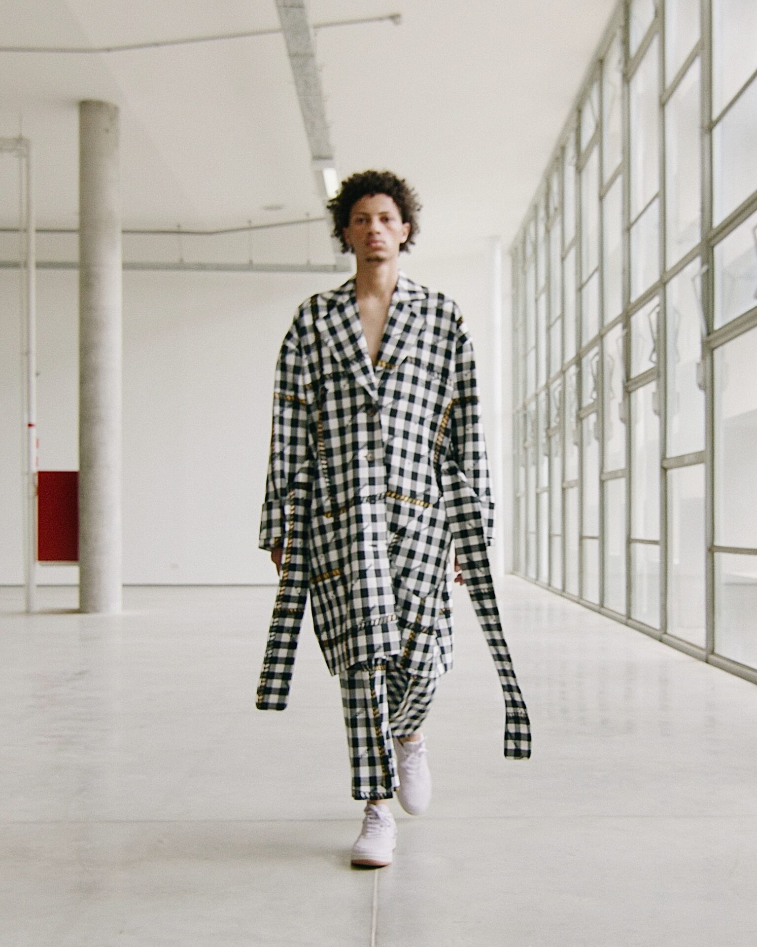 “Essa foi uma coleção que comecei a desenhar a partir da matéria prima”, diz Alexandre Herchcovitch. Desenvolvemos um material com nosso parceiro Branyl , que é extremamente leve, transparente e que não é fluído, daí então reproduzimos os best sellers da marca neste tecido transparente de alta tecnologia e que originalmente era destinado a calçados, fizemos mudanças na trama e na maciez para que pudesse ser vestível. Além da transparência, o material permite a troca de ar interno e externo quando vestido. Tênis Manobra desenvolvido em parceira com Olympikus completa todos os looks.