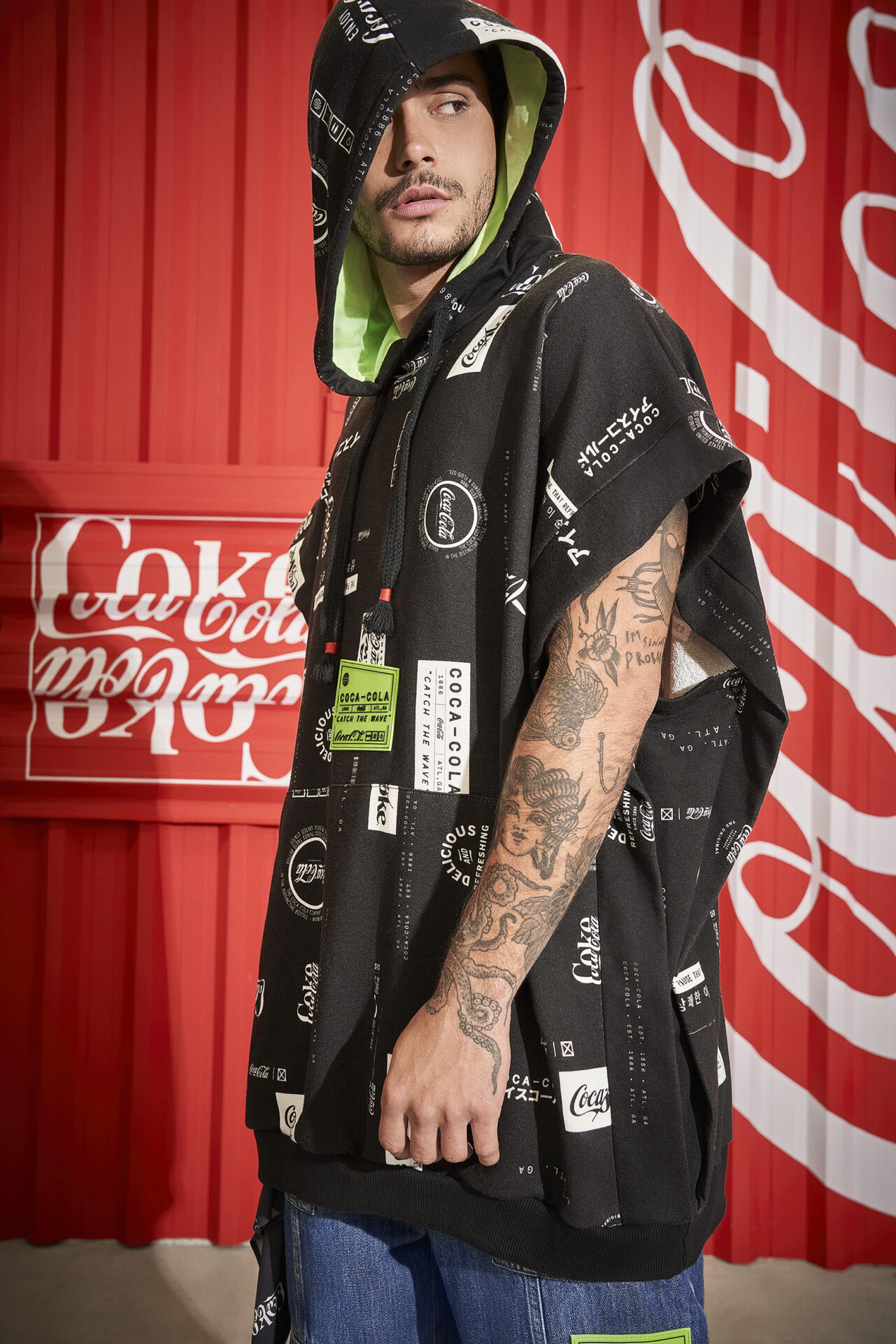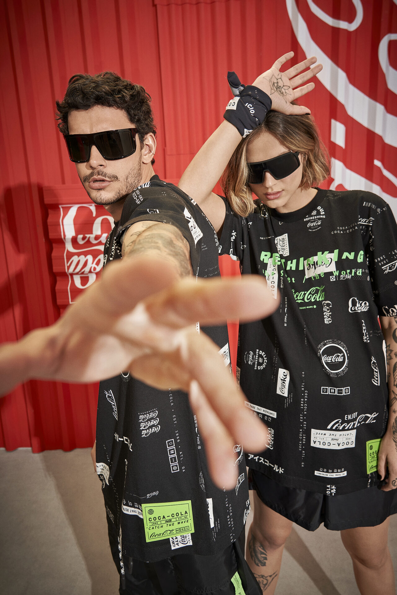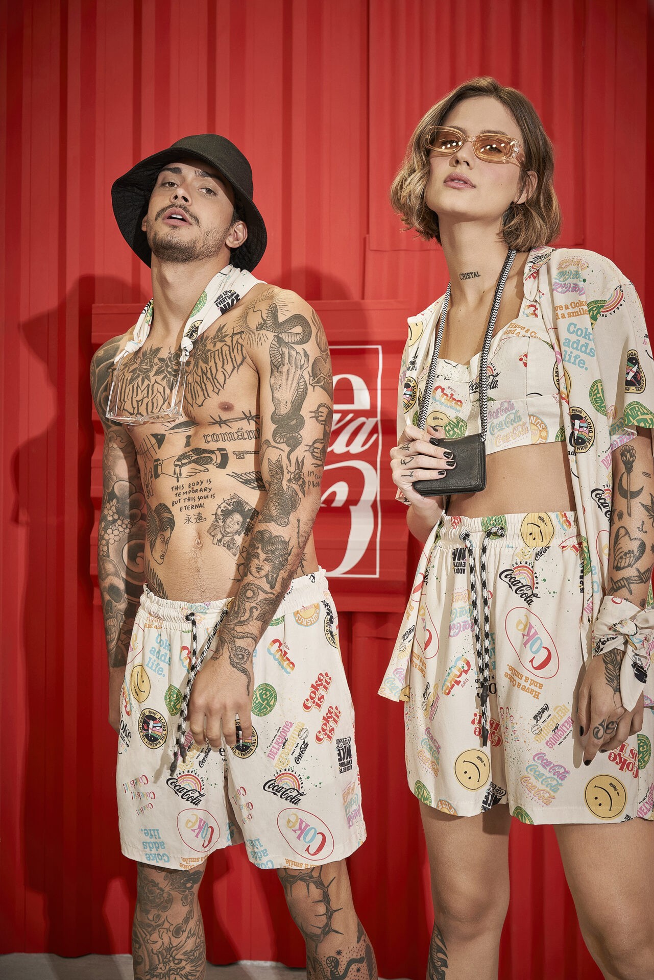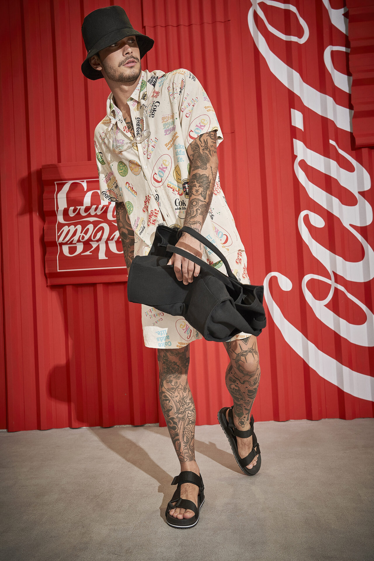 Há uma segunda linha de peças que traz o estilo urbano de forma mais divertida: em tons pastéis e modelagem relaxed, calças, bermudas, camisas e croppeds contam com uma estamparia repleta de emoticons e logos da marca de refrigerantes em uma junção das décadas 70 e 90.