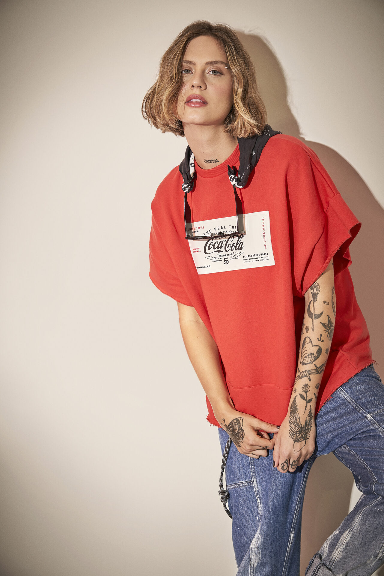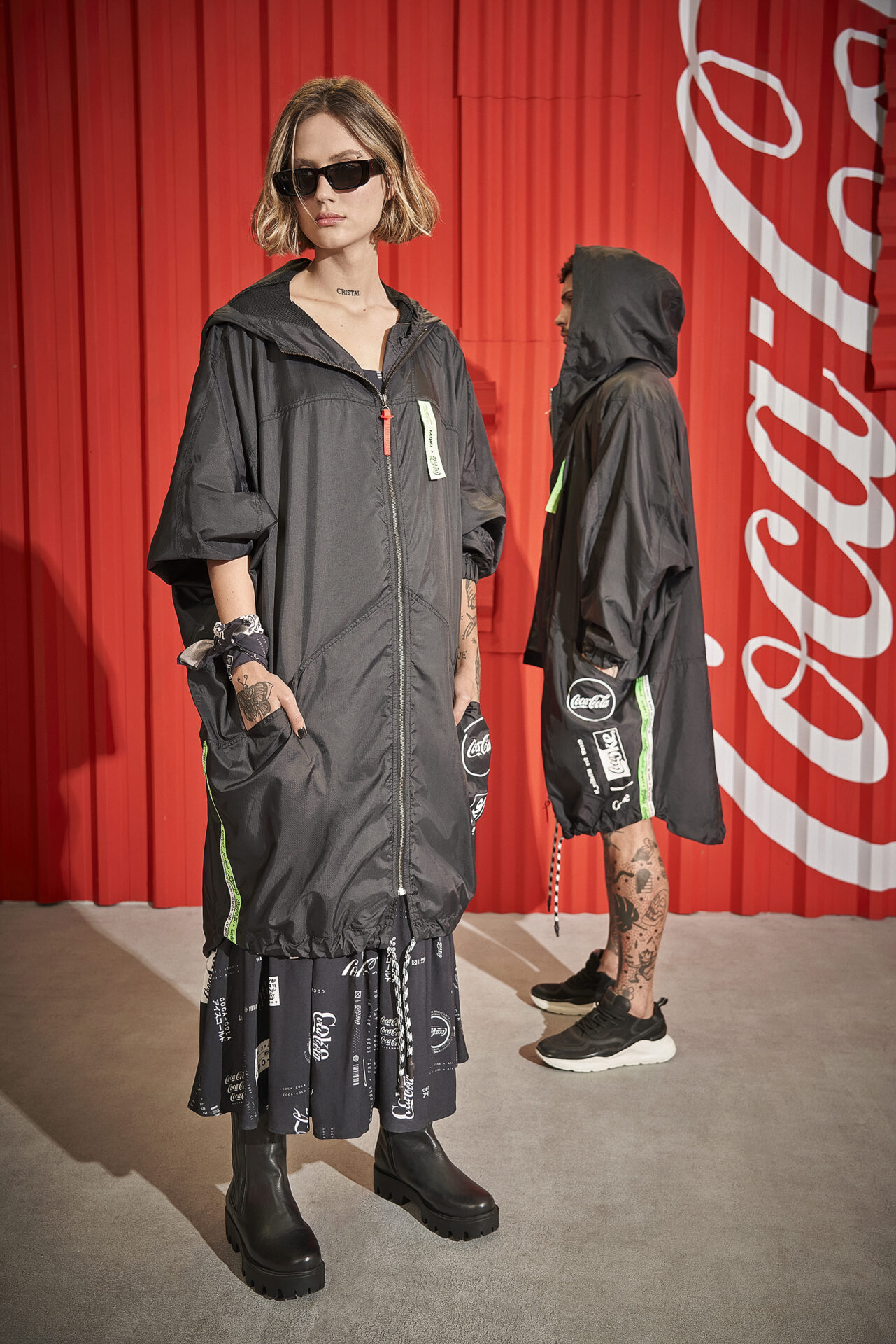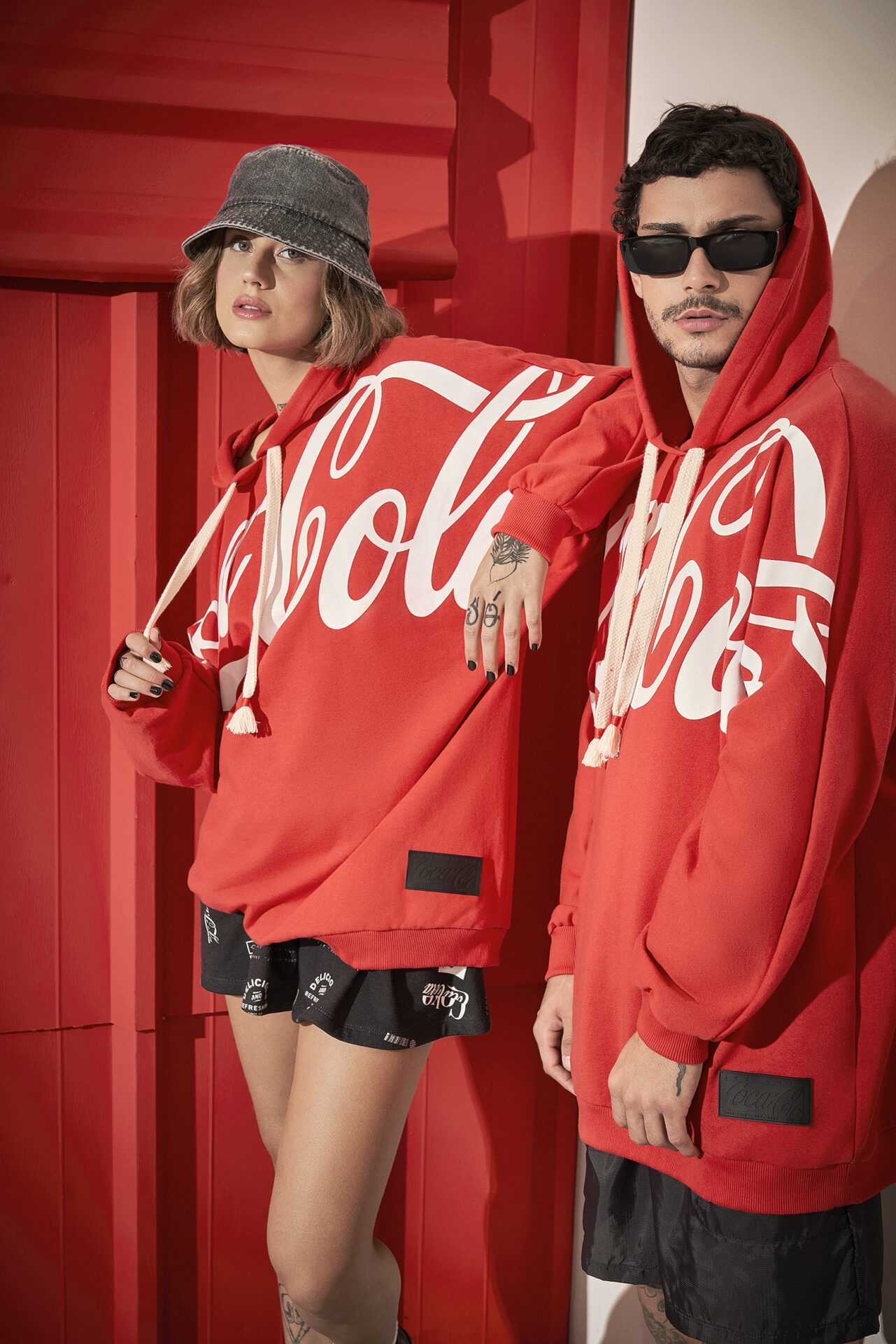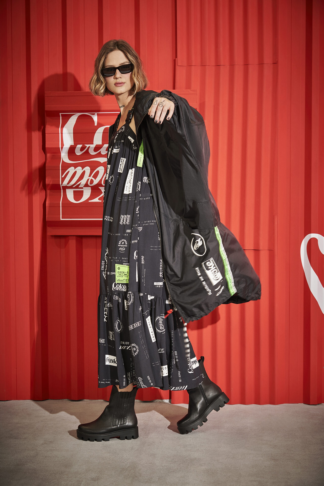 O vermelho, cor de grande importância para a Coca-Cola, aparece em moletons, camisetas e vestidos largos com os grafismos da marca americana em alto relevo e em grandes etiquetas de borracha.