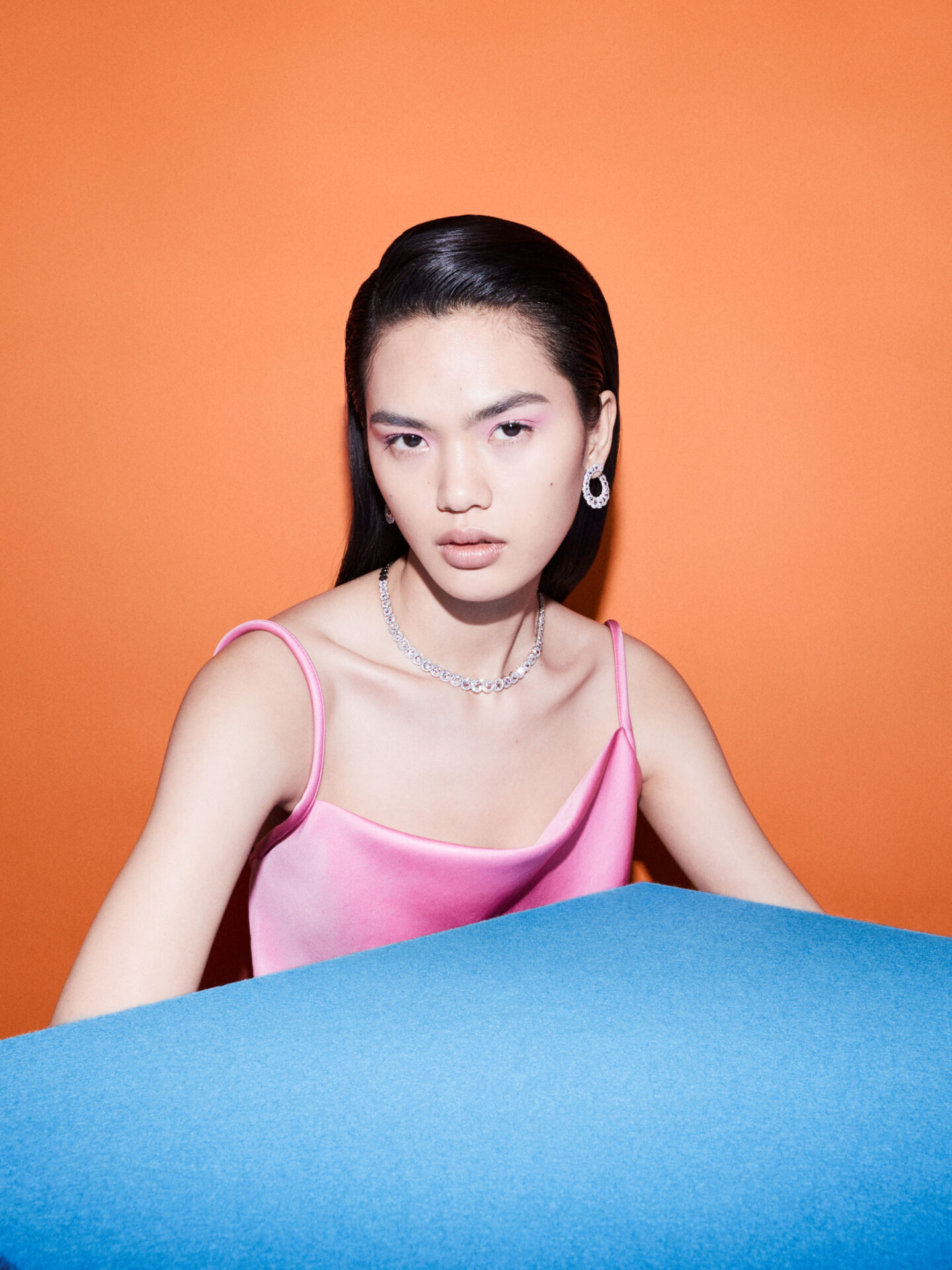 Como tal, cada imagem apresenta um toque de alta costura nas joias – um conjunto de brinco e colar de diamante branco fica ultra moderno quando estilizado com um vestido de seda inspirado nos anos 90; brincos de pérola se destacam em um vestido cor de tangerina; brincos cascata de diamante rosa combinados com um vestido rosa claro e óculos cor de rosa trazem o visual ‘combinandinho’ totalmente repaginado.