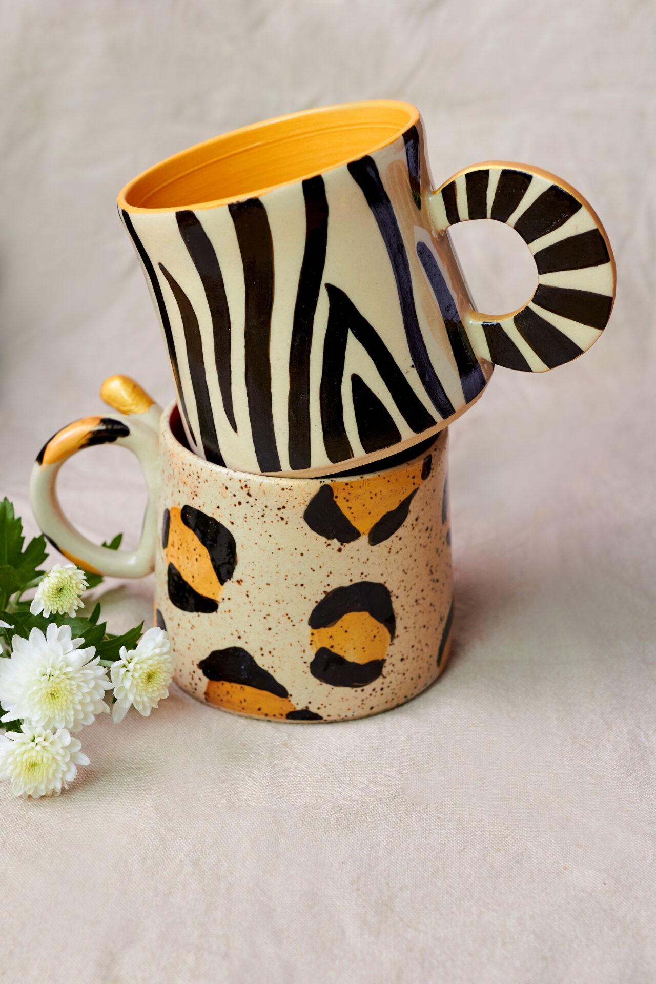 Serão dois modelos de caneca, sendo ambos em animal print, um de zebra e um de onça. Para a cartela de cores foram usados tons terrosos e preto com pontos de cor em vermelho, amarelo e dourado.