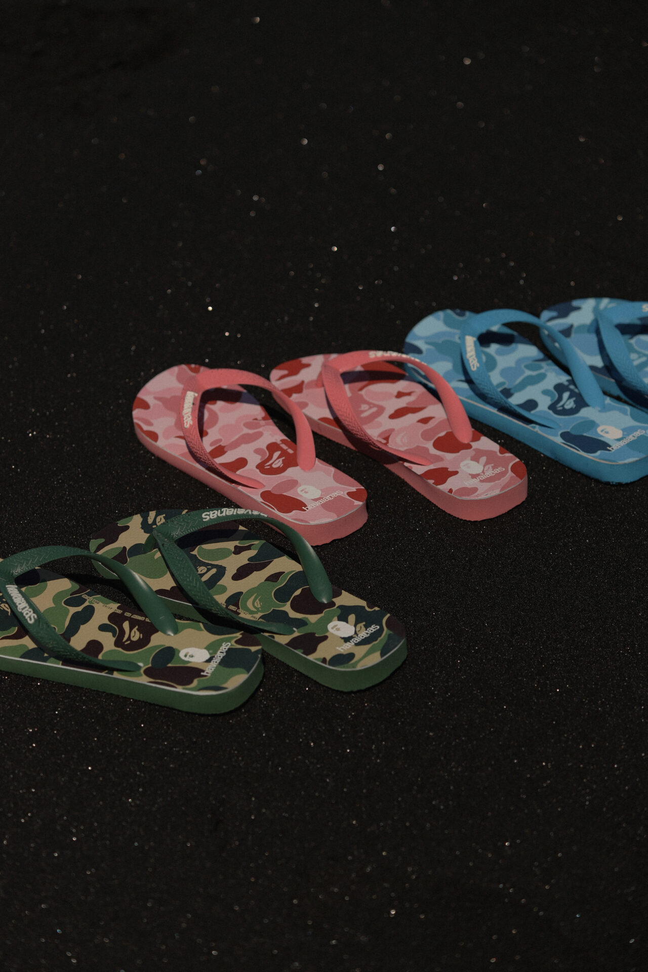 Com cinco modelos inéditos, disponíveis nas versões Top e Tradi Zori, a collab mescla a estampa camuflada característica de BAPE® às Havaianas. Na linha Top, tradicional de Havaianas, os confortáveis shapes emborrachados, disponíveis nas cores azul, rosa e verde, ganham mais ousadia graças à inspiração em Harajuku, conhecido pelo seu cenário de moda e arte de rua colorida.