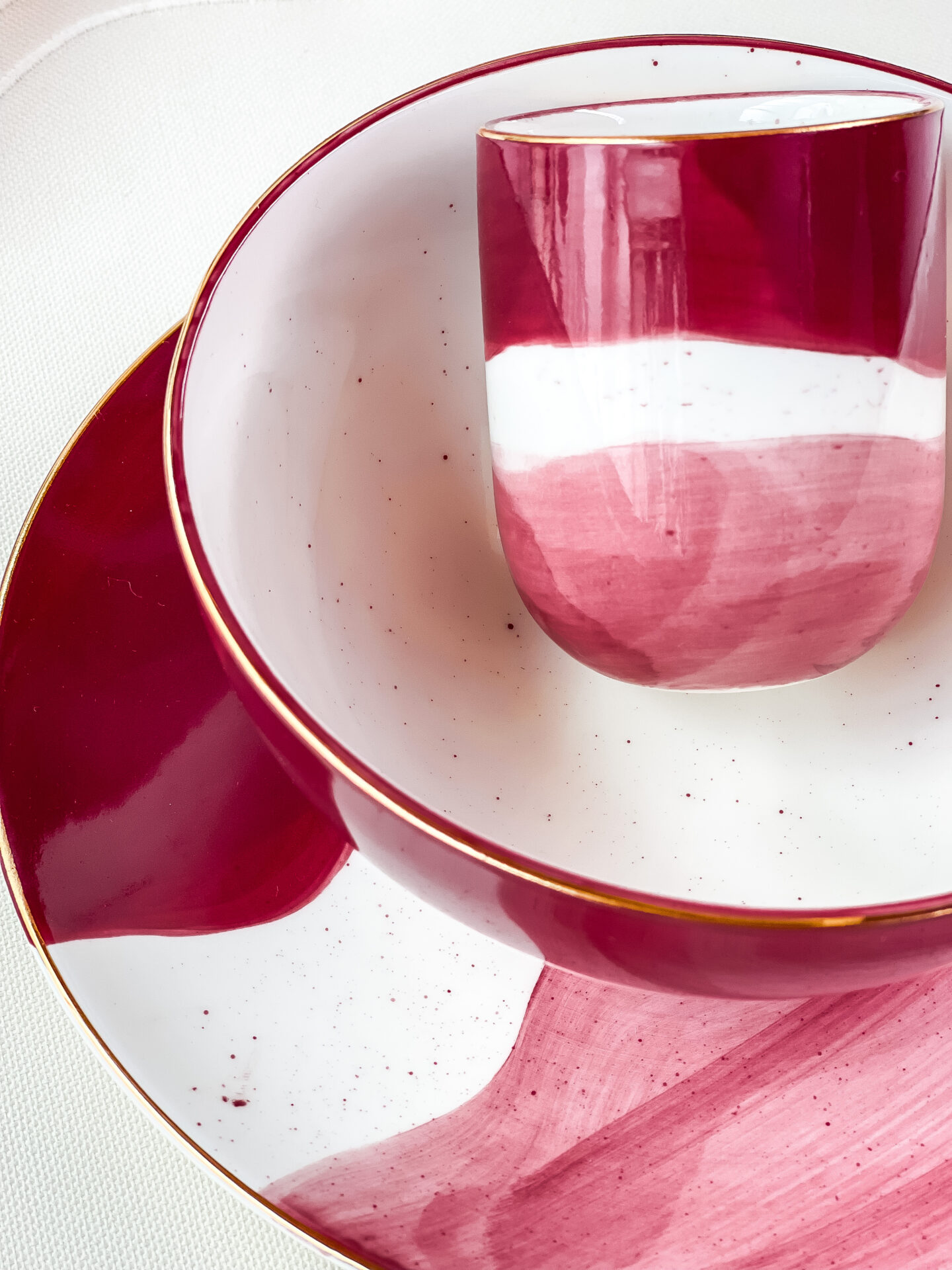 Para esse primeiro momento, pratos de sobremesa, pratos de jantar, bowls, xícaras, taças, jogos americanos, guardanapos, copos, chaleira, talheres, porta-copos, porta-vela aparecem com suas intervenções de tonalidades no dourado, marsala, rosé, azul turquesa, verde, branco perolado e o coral.