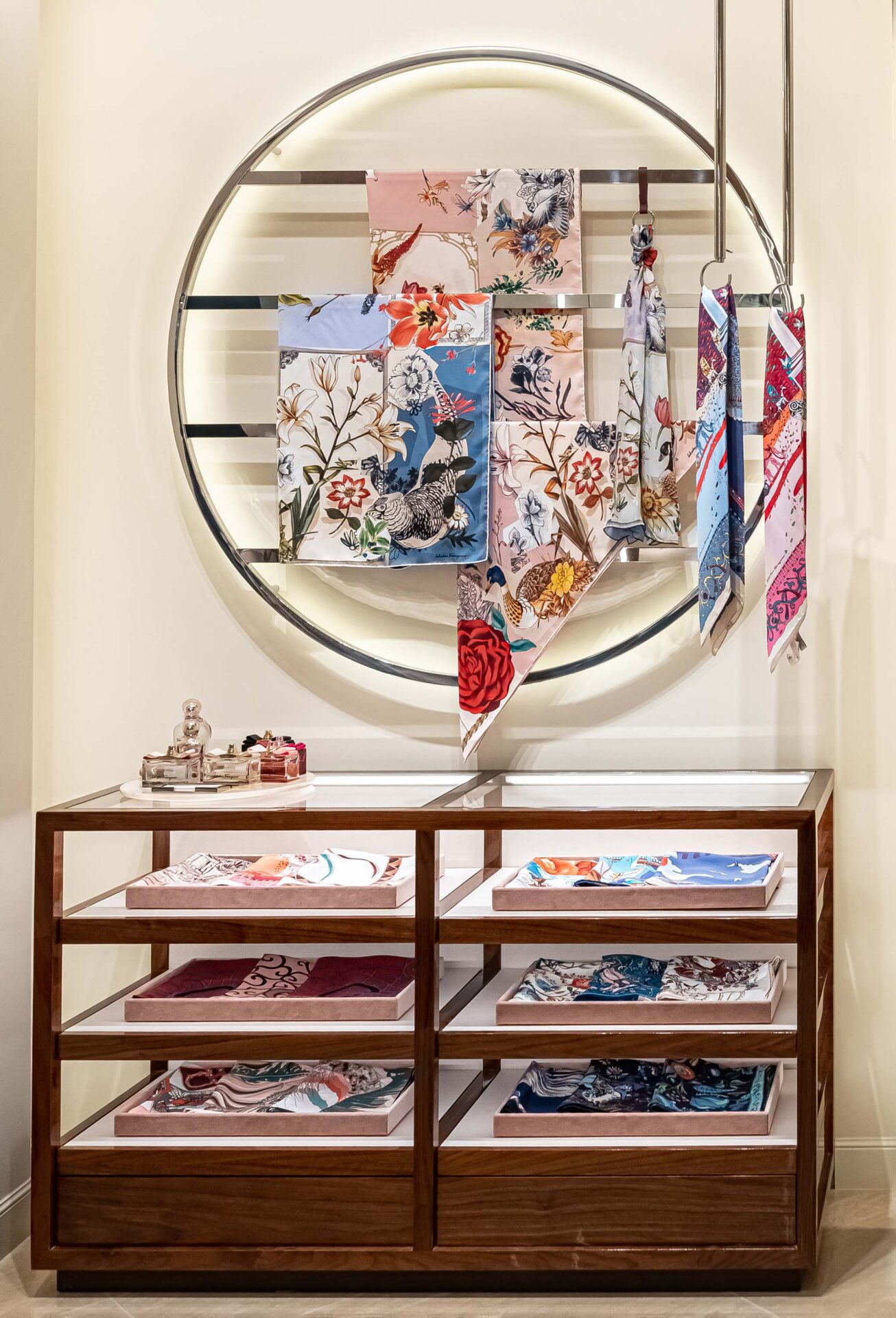 O conceito do design da nova loja do shopping JK Iguatemi baseia-se em curvas retilíneas, com esquema de cores e texturas harmoniosas que vão desde nogueira, veludo e toda uma gama de tonalidades que evocam a sensação calorosa do verão na Toscana. Materiais luxuosos decoram e envolvem a loja – como mármores travertino, etrusco e rosa – trazendo uma variedade de pedras nobres com veios naturais. O mobiliário e a iluminação foram concebidos pela equipe de design sediada na Itália, em colaboração com profissionais locais. A boutique reforça e ilustra as intenções da Ferragamo no Brasil: a necessidade de expandir os valores da marca e a beleza do design italiano – não apenas na moda e no vestuário, mas também na atmosfera e no lifestyle. A Salvatore Ferragamo JK Iguatemi é um espaço curvilíneo, sofisticado, com materiais de alta qualidade, representando o que há de melhor na Maison italiana.