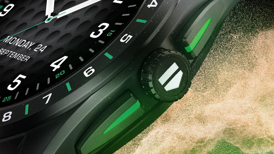 O modelo de 45 mm tem um design esportivo e um poderoso bisel de cerâmica que lhe dá a sensação de um relógio tradicional de alta qualidade, realçado com o verde icônico do Golf Edition. O icônico bisel de 18 buracos fornece um cartão de pontuação imediato durante uma rodada com segmentos codificados por cores mostrando em cada buraco se você estiver acima, dentro ou abaixo do par do campo. Os botões do relógio têm uma sensação mecânica, destacando os 160 anos de herança da TAG Heuer na fabricação de relógios mecânicos de alta qualidade – e o relógio se inclina para dentro, por isso parece mais leve no pulso do que as gerações anteriores do Connected Golf Edition.